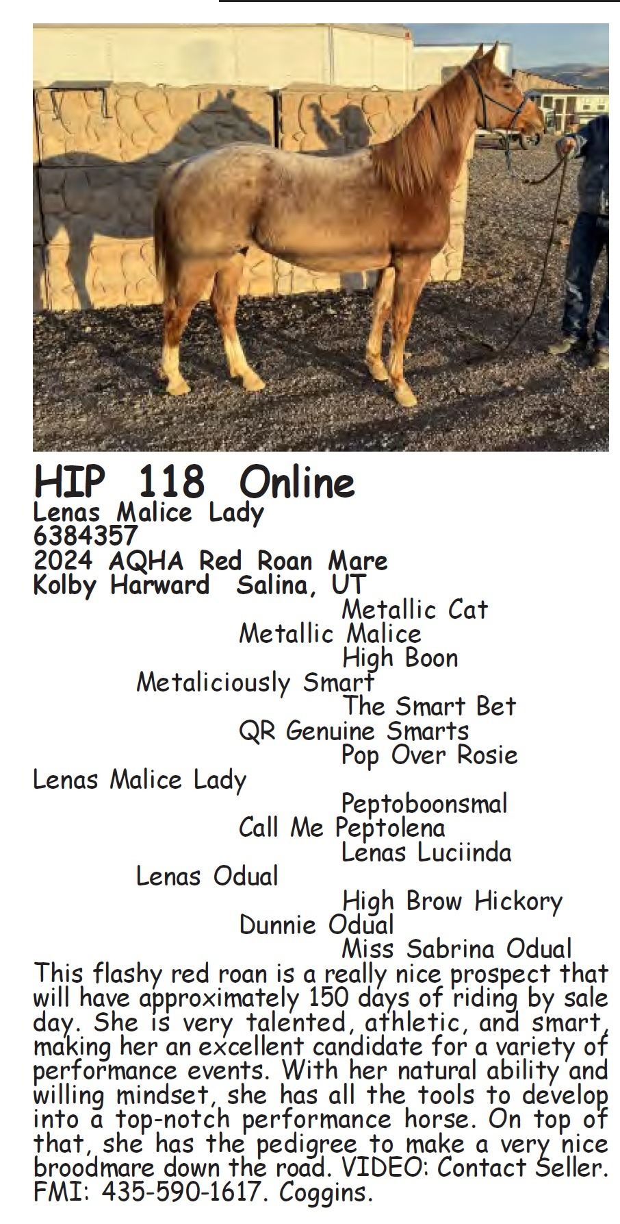Lenas Malice Lady - 6384357 - 2024 AQHA Red Roan Mare - Kolby Harward, Salina, UT - This flashy red roan is a really nice prospect that will have approximately 150 days of riding by sale day. She is very talented, athletic, and smart, making her an excellent candidate for a variety of performance events. With her natural ability and willing mindset, she has all the tools to develop into a top-notch performance horse. On top of that, she has the pedigree to make a very nice broodmare down the road. VIDEO: Contact Seller. FMI: 435-590-1617. Coggins.