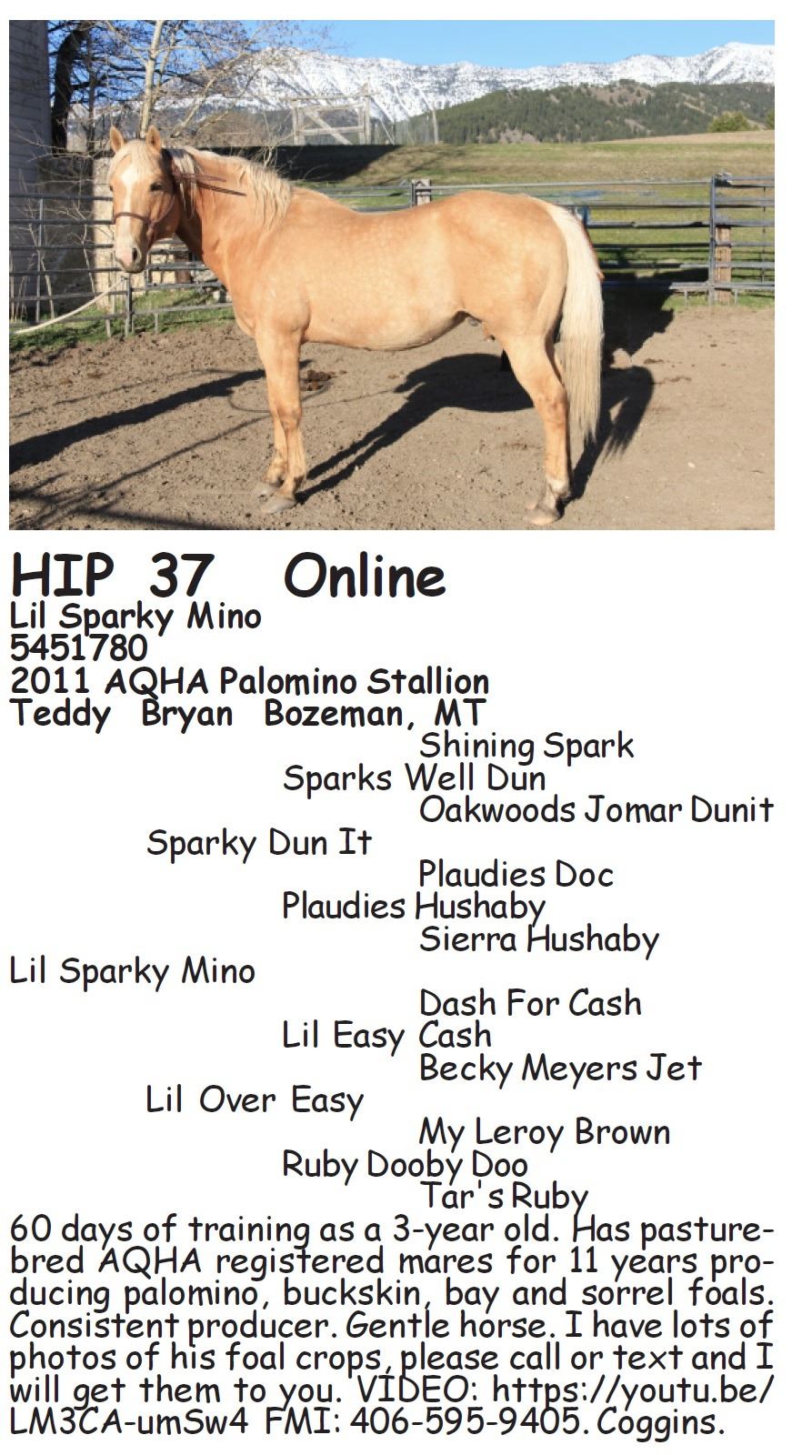 2011 AQHA Palomino Stallion x Sparky Dun It x Sparks Well Dun out of Lil Over Easy x Lil Easy Cash. 60 days of training as a 3-year old. Has pasture-bred AQHA registered mares for 11 years producing palomino, buckskin, bay and sorrel foals. Consistent producer. Gentle horse. I have lots of photos of his foal crops, please call or text and I will get them to you. VIDEO: Contact Seller. FMI: 406-595-9405. Coggins.