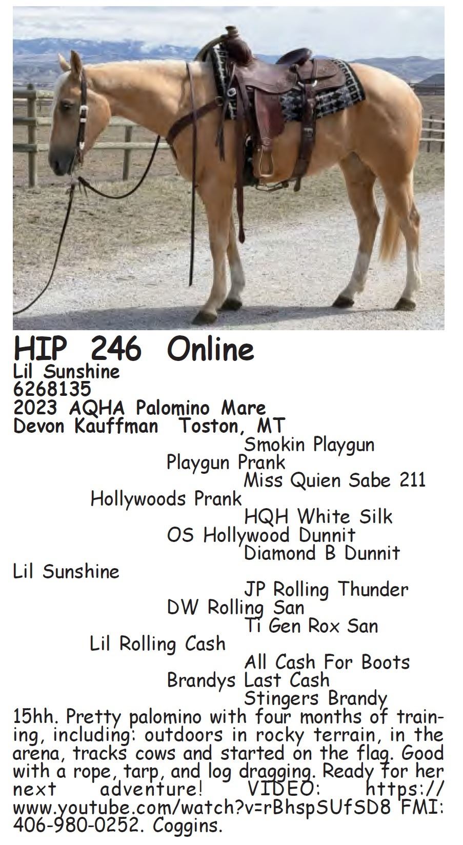 Lil Sunshine - 6268135 - 2023 AQHA Palomino Mare - Devon Kauffman, Toston, MT - 15hh. Pretty palomino with four months of training, including: outdoors in rocky terrain, in the arena, tracks cows and started on the flag. Good with a rope, tarp, and log dragging. Ready for her next adventure! VIDEO: https://www.youtube.com/watch?v=rBhspSUfSD8 FMI: 406-980-0252. Coggins.