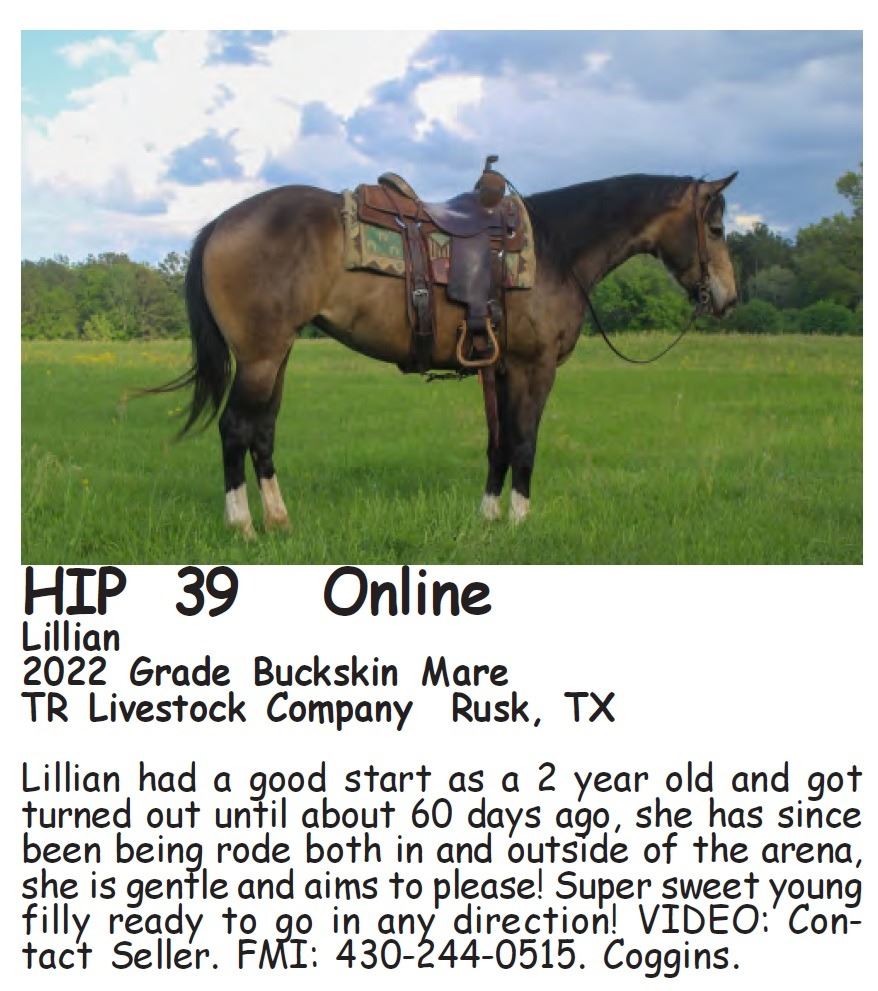 Lillian - 2022 Grade Buckskin Mare - TR Livestock Company, Rusk, TX - Lillian had a good start as a 2 year old and got turned out until about 60 days ago, she has since been being rode both in and outside of the arena, she is gentle and aims to please! Super sweet young filly ready to go in any direction! VIDEO: Contact Seller. FMI: 430-244-0515. Coggins.