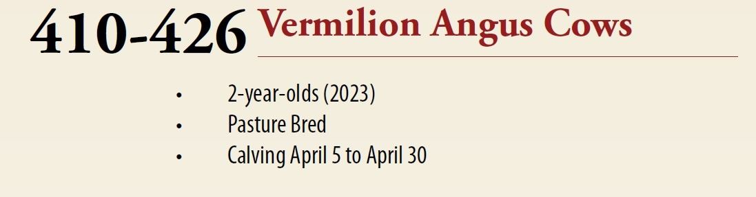 All bulls will be covered 50% by Vermilion Ranch if they are injured during their first breeding season. Breeding season is defined as the 60-day period following the first turnout of bulls.