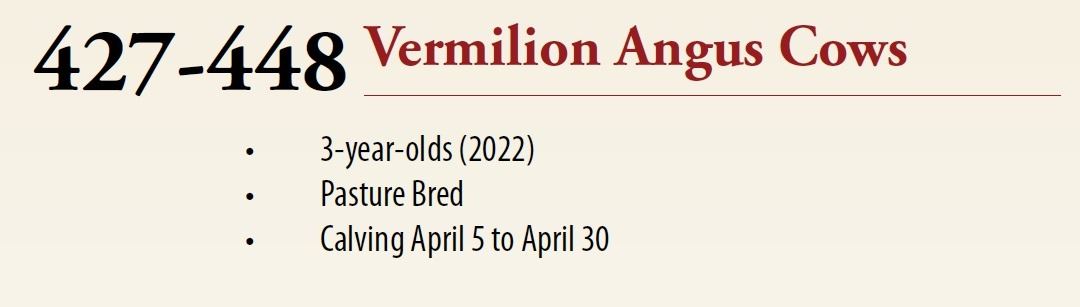All bulls will be covered 50% by Vermilion Ranch if they are injured during their first breeding season. Breeding season is defined as the 60-day period following the first turnout of bulls.