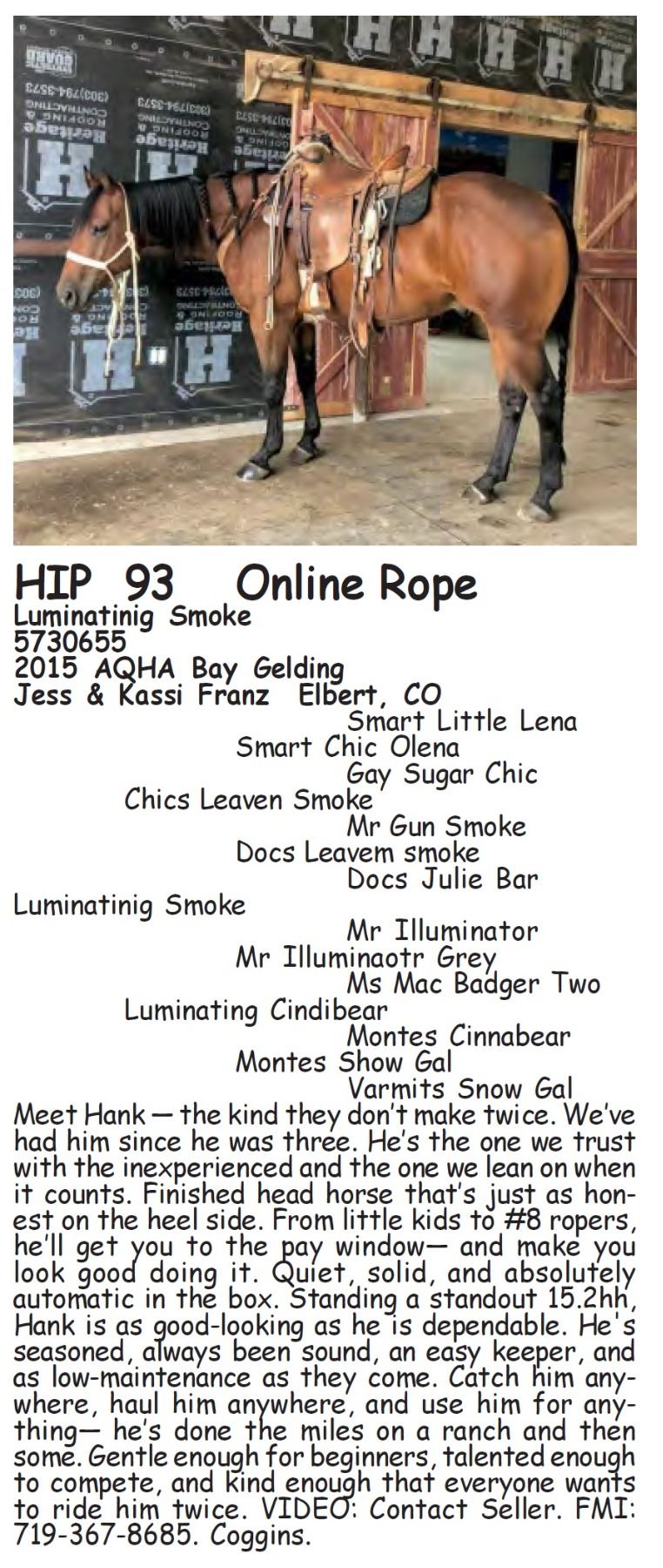 Luminatinig Smoke - 5730655 - 2015 AQHA Bay Gelding - Jess & Kassi Franz, Elbert, CO - Meet Hank — the kind they don’t make twice. We’ve had him since he was three. He’s the one we trust with the inexperienced and the one we lean on when it counts. Finished head horse that’s just as honest on the heel side. From little kids to #8 ropers, he’ll get you to the pay window— and make you look good doing it. Quiet, solid, and absolutely automatic in the box. Standing a standout 15.2hh, Hank is as good-looking as he is dependable. He's seasoned, always been sound, an easy keeper, and as low-maintenance as they come. Catch him anywhere, haul him anywhere, and use him for anything— he’s done the miles on a ranch and then some. Gentle enough for beginners, talented enough to compete, and kind enough that everyone wants to ride him twice. VIDEO: Contact Seller. FMI: 719-367-8685. Coggins.