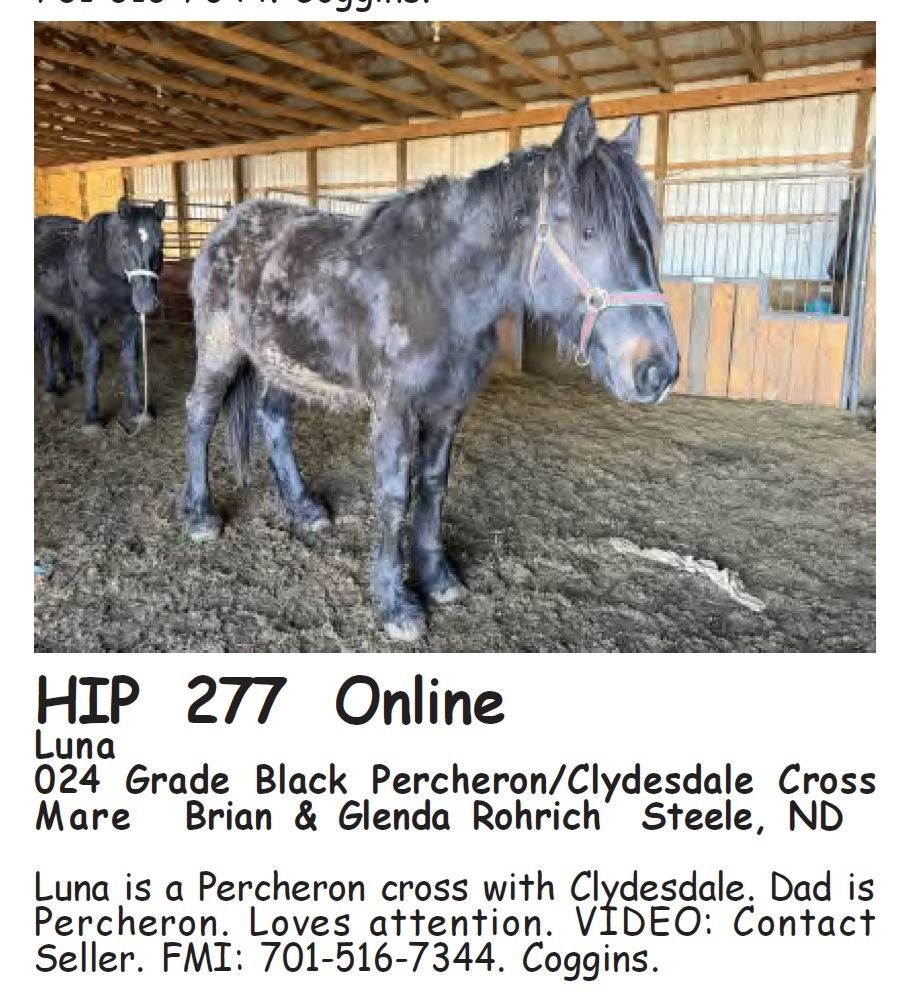 Luna - 2024 Grade Black Percheron/Clydesdale Cross Mare - Brian & Glenda Rohrich, Steele, ND - Luna is a Percheron cross with Clydesdale. Dad is Percheron. Loves attention. VIDEO: Contact Seller. FMI: 701-516-7344. Coggins.