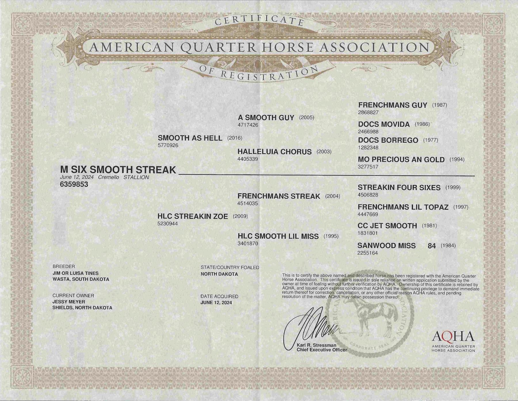 2024 AQHA Cremello Stallion x Smooth as Hell x A Smooth Guy out of HLC Streakin Zoe x Frenchmans Streak. 2-year-old Cremello Stud. He is sired by SMOOTH AS HELL, son of $5 million sire A SMOOTH GUY. His dam is a daughter of FRENCHMANS STREAK. He is halter broke and ready to start your way. Keep him as a stud and add color to your herd. Willing to hold for 5 days. LOCATION: Shields, ND. VIDEO: Contact Seller. FMI: 701-400-4816. Coggins