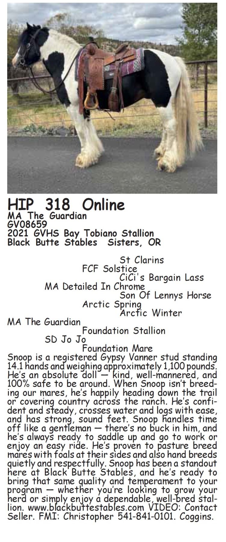Snoop is a registered Gypsy Vanner stud standing 14.1 hands and weighing approximately 1,100 pounds. He’s an absolute doll — kind, well-mannered, and 100% safe to be around. When Snoop isn’t breeding our mares, he’s happily heading down the trail or covering country across the ranch. He’s confident and steady, crosses water and logs with ease, and has strong, sound feet. Snoop handles time off like a gentleman — there’s no buck in him, and he’s always ready to saddle up and go to work or enjoy an easy ride. He’s proven to pasture breed mares with foals at their sides and also hand breeds quietly and respectfully. Snoop has been a standout here at Black Butte Stables, and he’s ready to bring that same quality and temperament to your program — whether you’re looking to grow your herd or simply enjoy a dependable, well-bred stallion. www.blackbuttestables.com VIDEO: Contact Seller. FMI: Christopher 541-841-0101. Coggins.