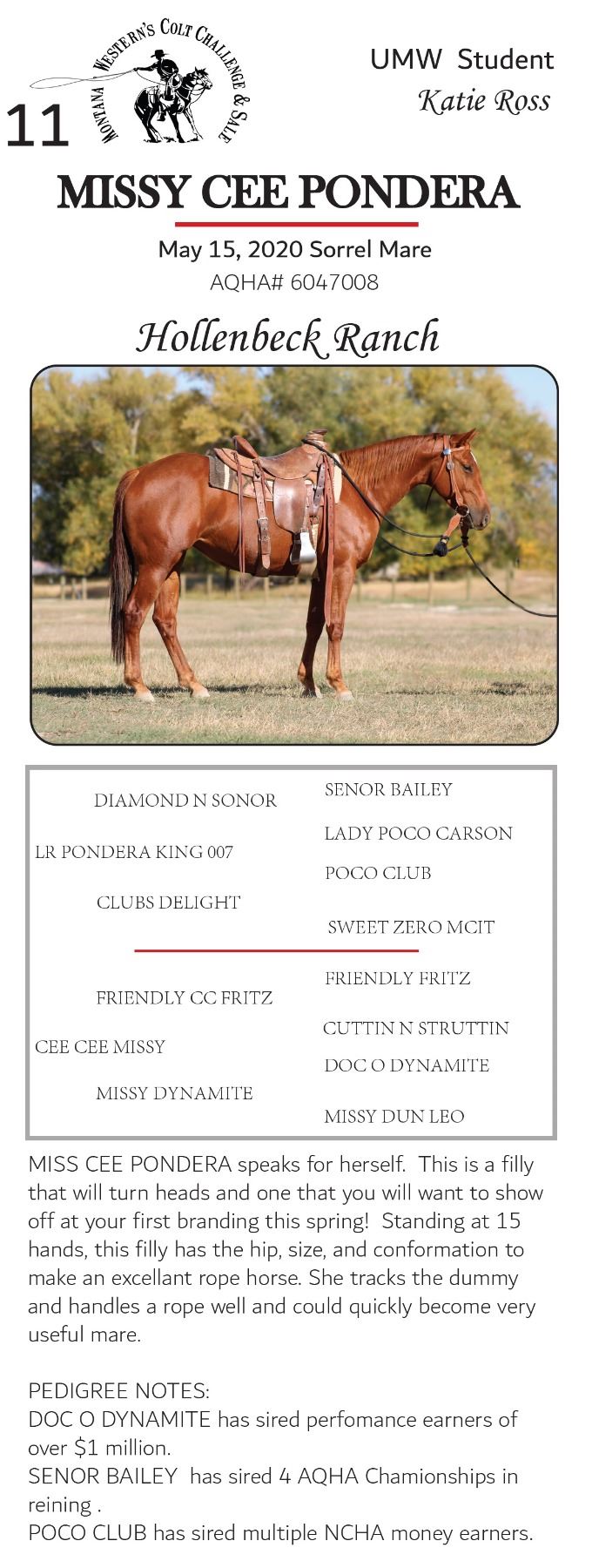 Miss Cee Pondera speaks for herself. This is a filly that will turn heads and one that you will want to show off at your first branding this spring. Standing at 15 hands, this filly has the hip, size, and conformation to make an excellent rope horse. She tracks the dummy and handles a rope well and could quickly become very useful mare.