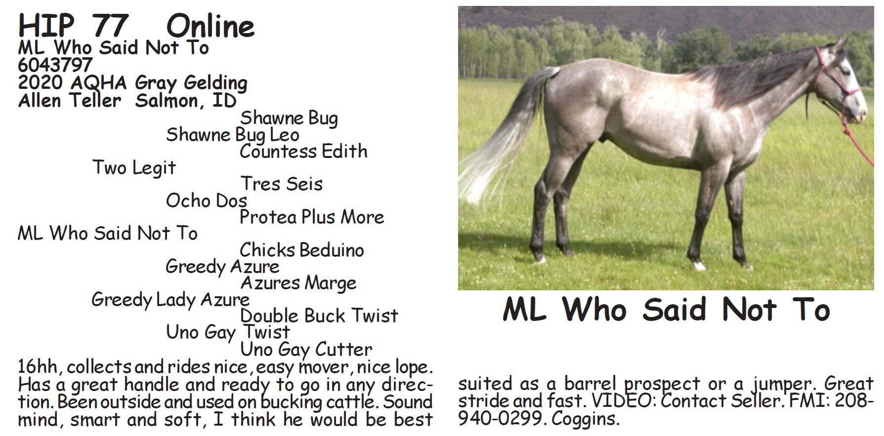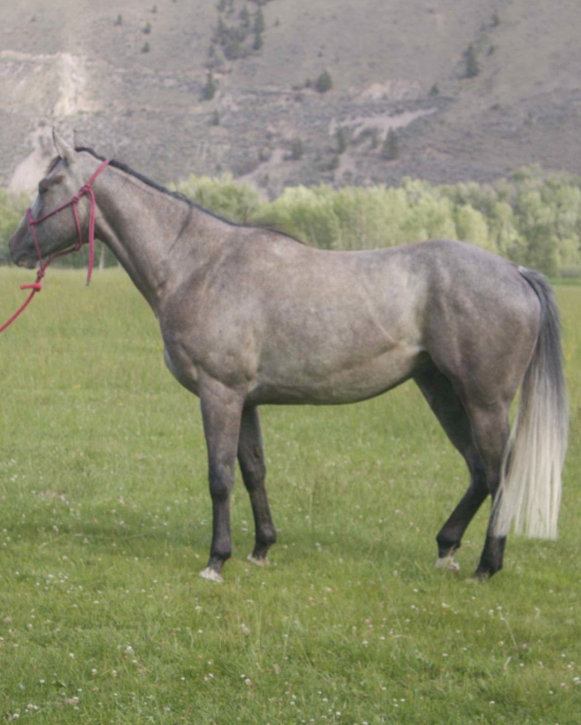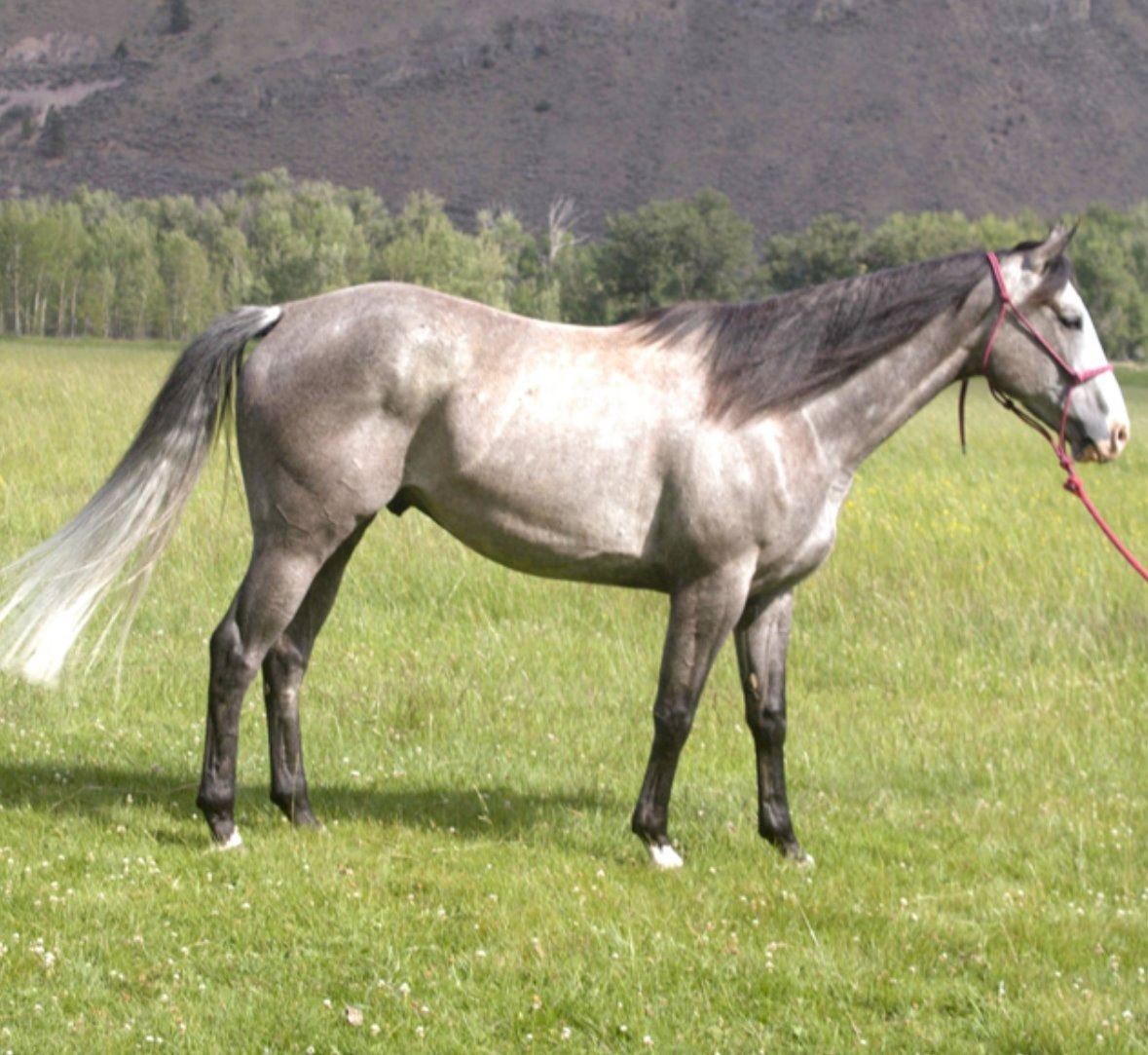 2020 AQHA Gray Gelding x Two Legit x Shawne Bug Leo out of Greedy Lady Azure x Greedy Azure. 16hh, collects and rides nice, easy mover, nice lope. Has a great handle and ready to go in any direction. Been outside and used on bucking cattle. Sound mind, smart and soft, I think he would be best suited as a barrel prospect or a jumper. Great stride and fast. VIDEO: Contact Seller. FMI: 208-940-0299. Coggins.