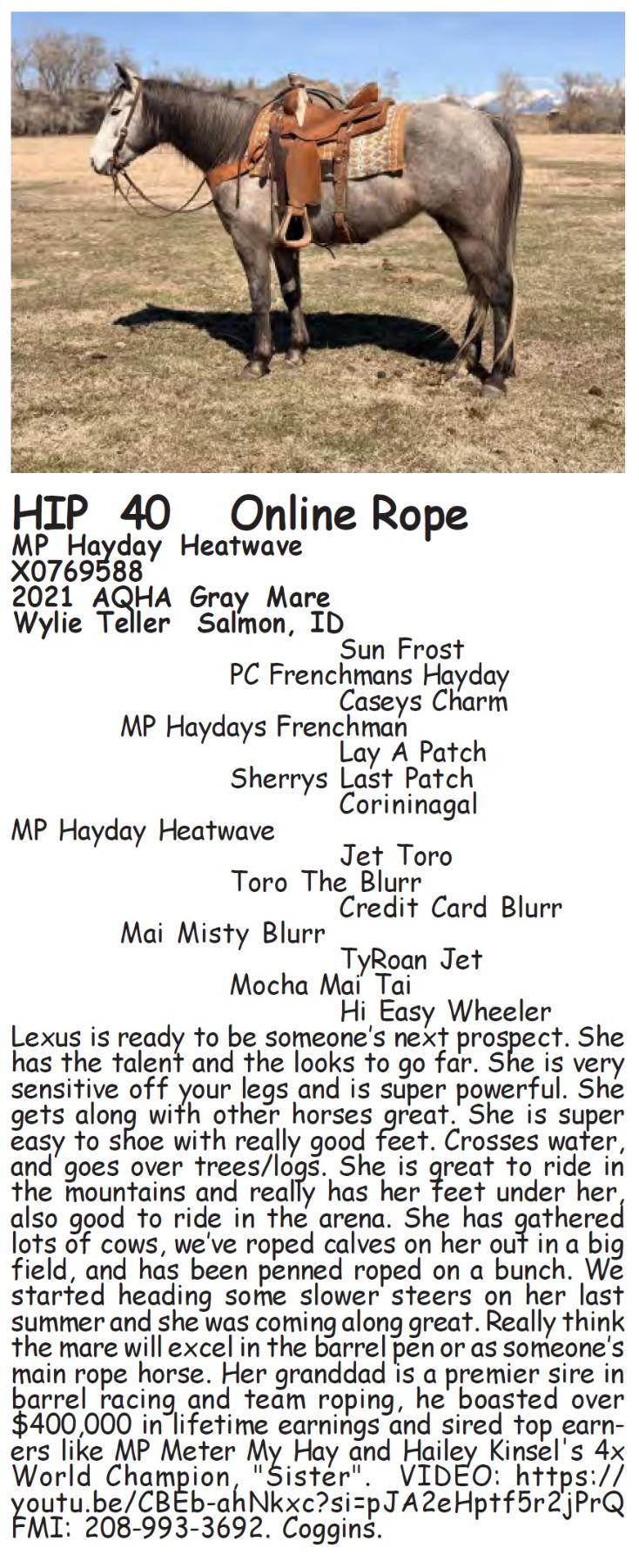 MP Hayday Heatwave - X0769588 - 2021 AQHA Gray Mare - Wylie Teller, Salmon, ID - Lexus is ready to be someone’s next prospect. She has the talent and the looks to go far. She is very sensitive off your legs and is super powerful. She gets along with other horses great. She is super easy to shoe with really good feet. Crosses water, and goes over trees/logs. She is great to ride in the mountains and really has her feet under her, also good to ride in the arena. She has gathered lots of cows, we’ve roped calves on her out in a big field, and has been penned roped on a bunch. We started heading some slower steers on her last summer and she was coming along great. Really think the mare will excel in the barrel pen or as someone’s main rope horse. Her granddad is a premier sire in barrel racing and team roping, he boasted over $400,000 in lifetime earnings and sired top earners like MP Meter My Hay and Hailey Kinsel's 4x World Champion, "Sister". VIDEO: https://youtu.be/CBEb-ahNkxc?si=pJA2eHptf5r2jPrQ FMI: 208-993-3692. Coggins.