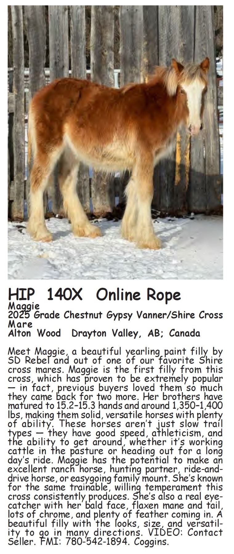 Maggie - 2025 Grade Chestnut Gypsy Vanner/Shire Cross Mare - Alton Wood, Drayton Valley, AB; Canada - Meet Maggie, a beautiful yearling paint filly by SD Rebel and out of one of our favorite Shire cross mares. Maggie is the first filly from this cross, which has proven to be extremely popular — in fact, previous buyers loved them so much they came back for two more. Her brothers have matured to 15.2–15.3 hands and around 1,350–1,400 lbs, making them solid, versatile horses with plenty of ability. These horses aren’t just slow trail types — they have good speed, athleticism, and the ability to get around, whether it’s working cattle in the pasture or heading out for a long day’s ride. Maggie has the potential to make an excellent ranch horse, hunting partner, ride-and-drive horse, or easygoing family mount. She’s known for the same trainable, willing temperament this cross consistently produces. She’s also a real eye-catcher with her bald face, flaxen mane and tail, lots of chrome, and plenty of feather coming in. A beautiful filly with the looks, size, and versatility to go in many directions. VIDEO: Contact Seller. FMI: 780-542-1894. Coggins.