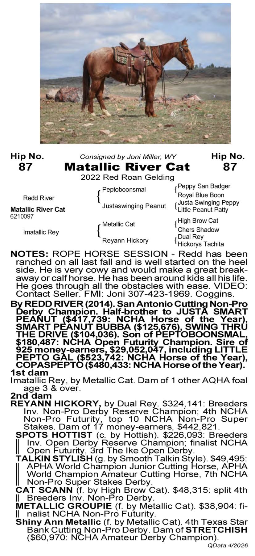 Matallic River Cat -6210097 - 2022 AQHA Red Roan Gelding - Joni Miller, Ranchester, WY - Redd has been ranched on all last fall and is well started on the heel side. He is very cowy and would make a great breakaway or calf horse. He has been around kids all his life. He goes through all the obstacles with ease. VIDEO: Contact Seller. FMI: Jon 307-423-1969. Coggins
