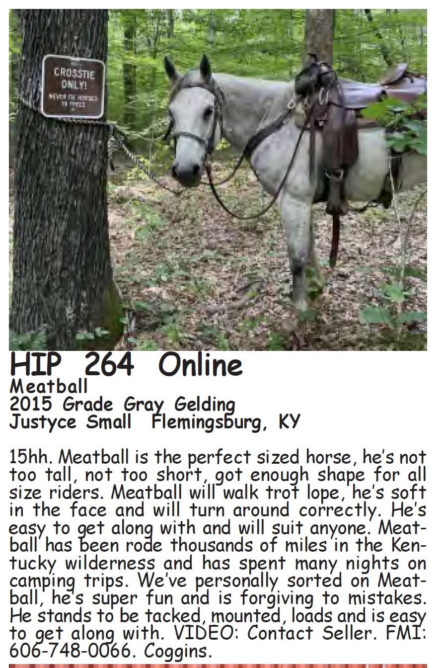 Meatball - 2015 Grade Gray Gelding - Justyce Small, Flemingsburg, KY - 15hh. Meatball is the perfect sized horse, he’s not too tall, not too short, got enough shape for all size riders. Meatball will walk trot lope, he’s soft in the face and will turn around correctly. He’s easy to get along with and will suit anyone. Meatball has been rode thousands of miles in the Kentucky wilderness and has spent many nights on camping trips. We’ve personally sorted on Meatball, he’s super fun and is forgiving to mistakes. He stands to be tacked, mounted, loads and is easy to get along with. VIDEO: Contact Seller. FMI: 606-748-0066. Coggins.