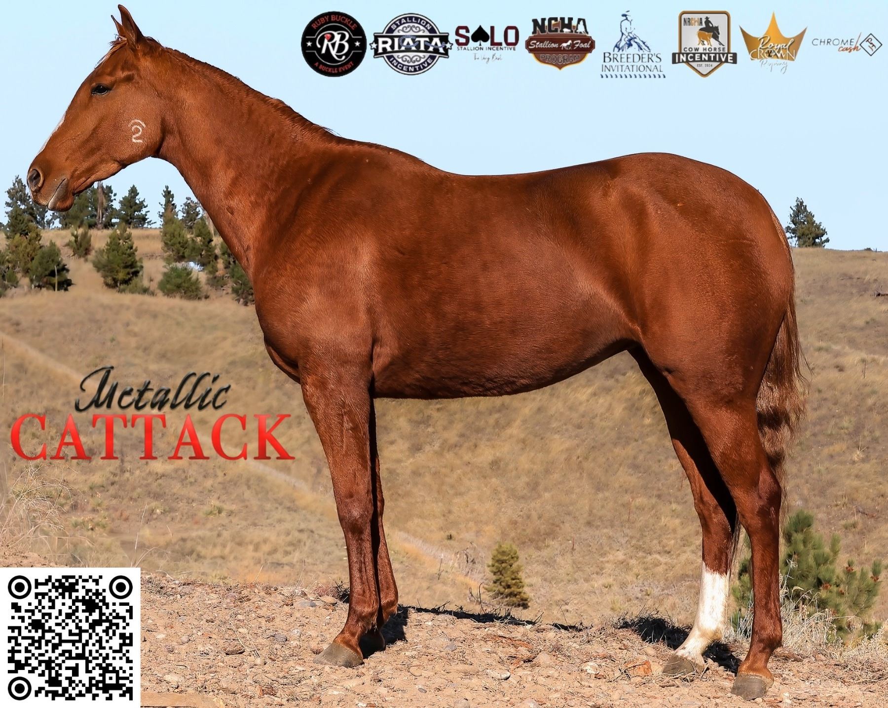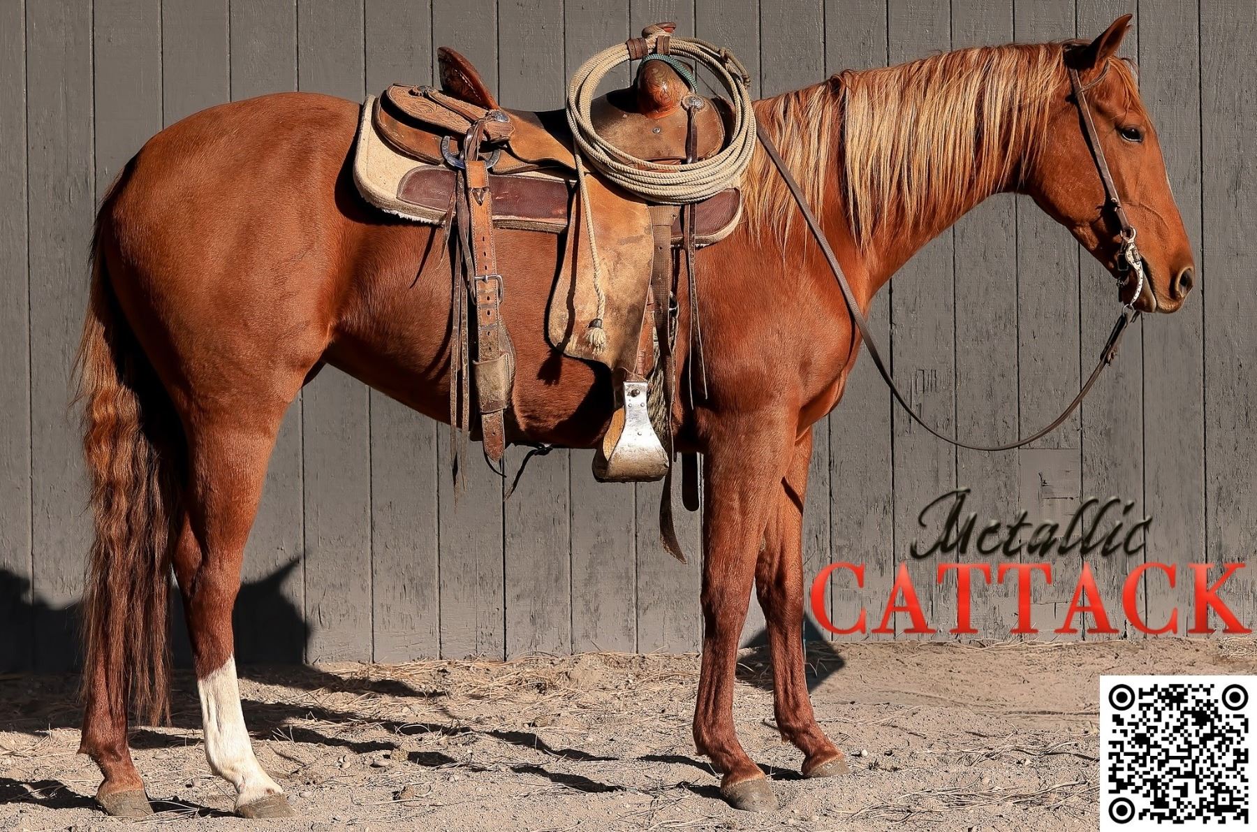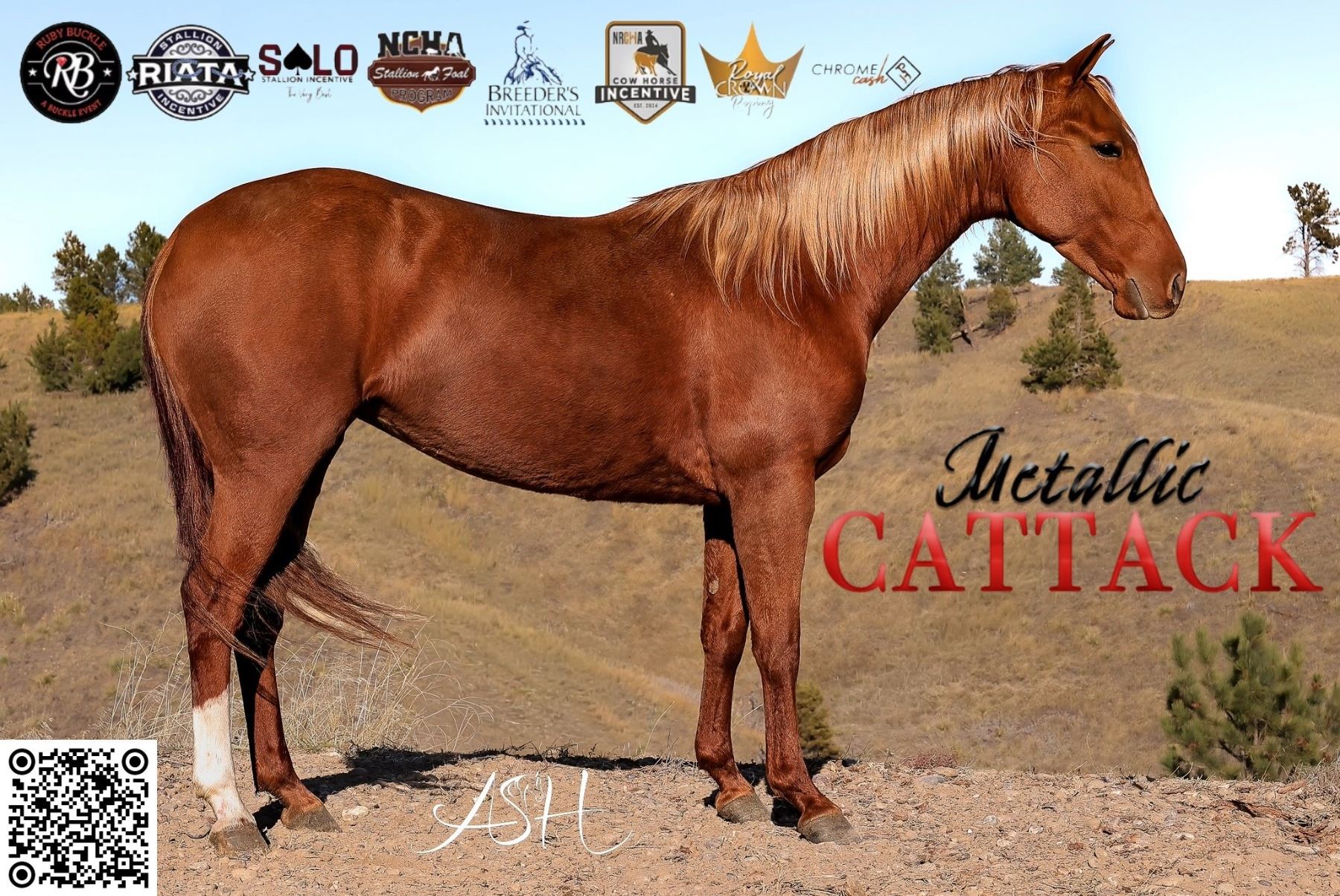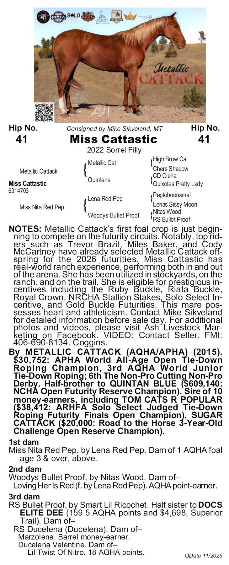 2022 AQHA Sorrel Mare x Metallic Cattack x Metallic Cat out of Miss Nita Red Pep x Lena Red Pep. Metallic Cattack’s first foal crop is just beginning to compete on the futurity circuits. Notably, top riders such as Trevor Brazil, Miles Baker, and Cody McCartney have already selected Metallic Cattack offspring for the 2026 futurities. Miss Cattastic has real-world ranch experience, performing both in and out of the arena. She has been utilized in stockyards, on the ranch, and on the trail. She is eligible for prestigious incentives including the Ruby Buckle, Riata Buckle, Royal Crown, NRCHA Stallion Stakes, Solo Select Incentive, and Gold Buckle Futurities, positioning her for substantial payouts in barrels, roping, cow horse, or cutting. This mare possesses the heart, athleticism and pedigree to excel at the highest level. Contact Mike Sikveland for detailed information before sale day. For additional photos and videos, please visit Ash Livestock Marketing on Facebook. VIDEO: Contact Seller. FMI: 406-690-8134. Coggins.