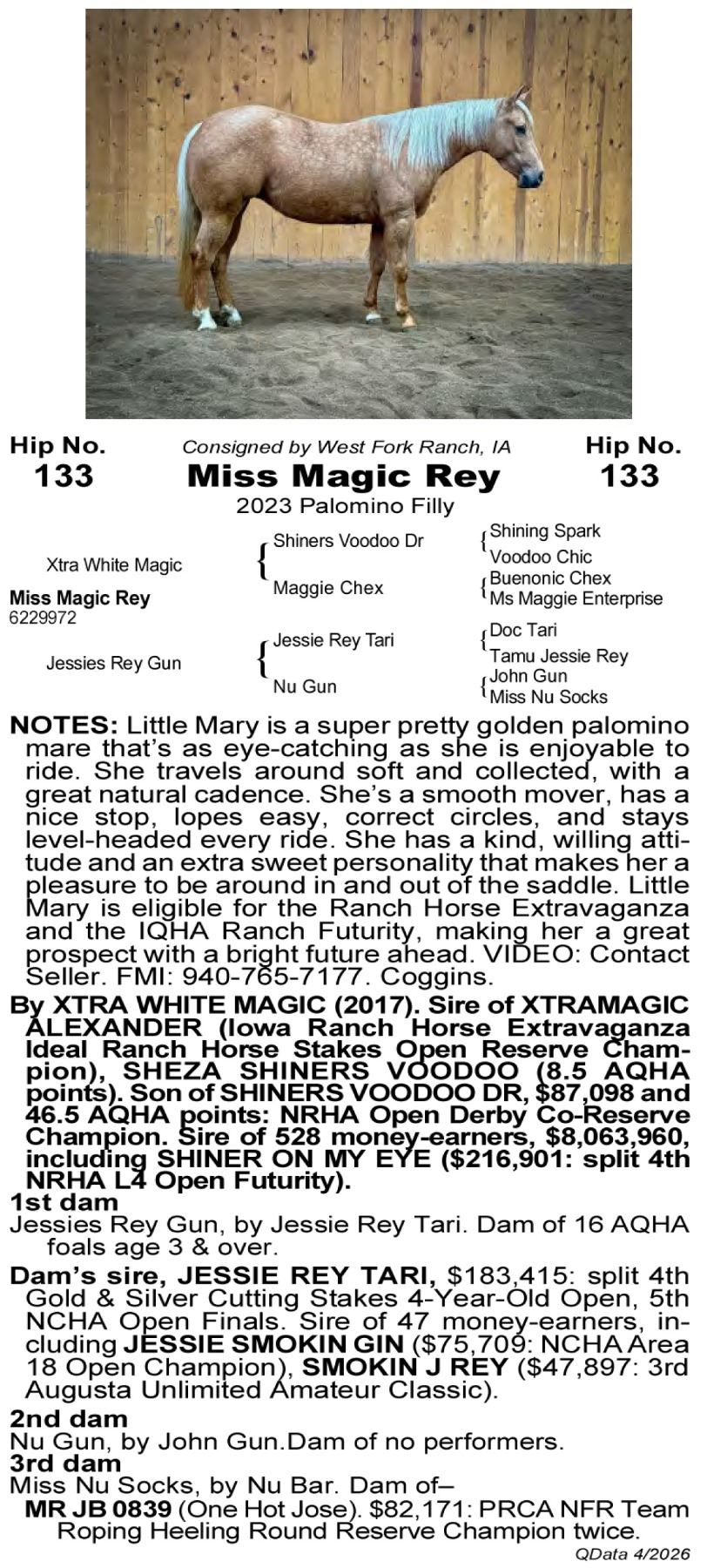 Miss Magic Rey -6229972 - 2023 AQHA Palomino Mare - West Fork Ranch, Sheffield, IA - Little Mary is a super pretty golden palomino mare that’s as eye-catching as she is enjoyable to ride. She travels around soft and collected, with a great natural cadence. She’s a smooth mover, has a nice stop, lopes easy, correct circles, and stays level-headed every ride. She has a kind, willing attitude and an extra sweet personality that makes her a pleasure to be around in and out of the saddle. Little Mary is eligible for the Ranch Horse Extravaganza and the IQHA Ranch Futurity, making her a great prospect with a bright future ahead. VIDEO: Contact Seller. FMI: 940-765-7177. Coggins.