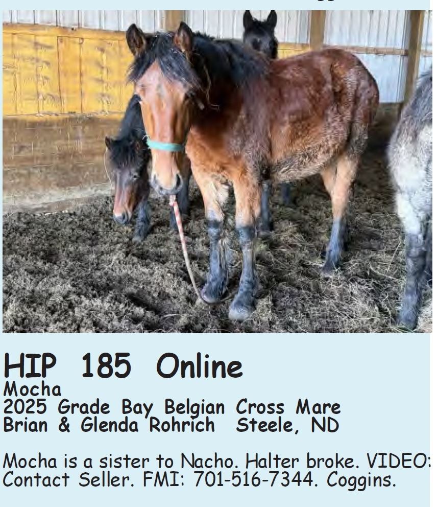 Mocha - 2025 Grade Bay Belgian Cross Mare - Brian & Glenda Rohrich, Steele, ND - Mocha is a sister to Nacho. Halter broke. VIDEO: Contact Seller. FMI: 701-516-7344. Coggins.
