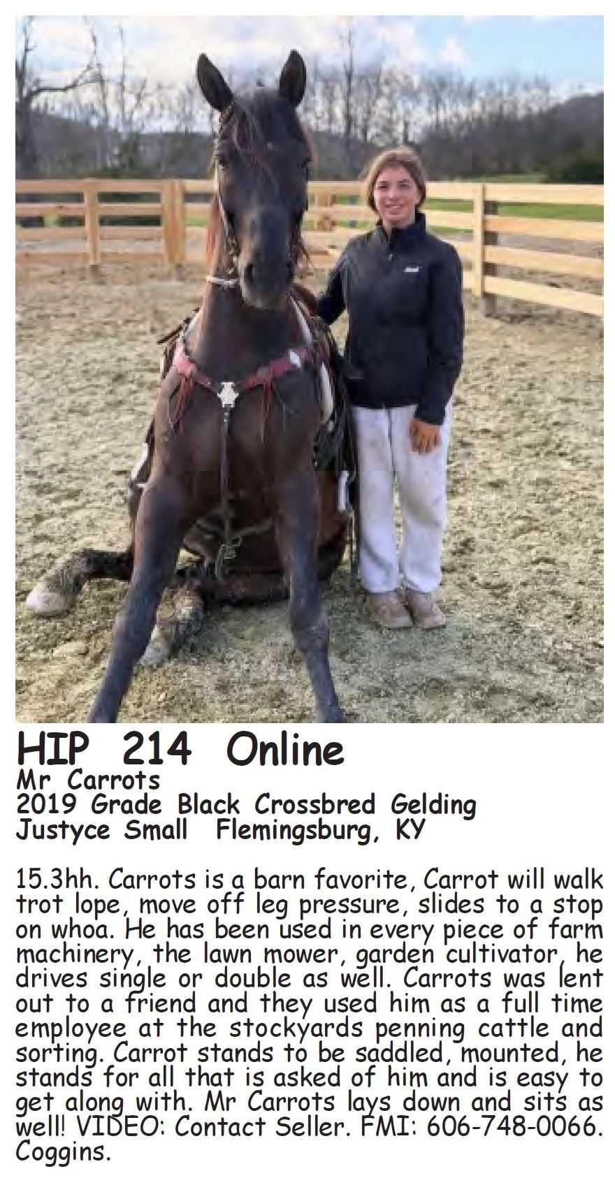 Mr Carrots - 2019 Grade Black Crossbred Gelding - Justyce Small, Flemingsburg, KY - 15.3hh. Carrots is a barn favorite, Carrot will walk trot lope, move off leg pressure, slides to a stop on whoa. He has been used in every piece of farm machinery, the lawn mower, garden cultivator, he drives single or double as well. Carrots was lent out to a friend and they used him as a full time employee at the stockyards penning cattle and sorting. Carrot stands to be saddled, mounted, he stands for all that is asked of him and is easy to get along with. Mr Carrots lays down and sits as well! VIDEO: Contact Seller. FMI: 606-748-0066. Coggins.