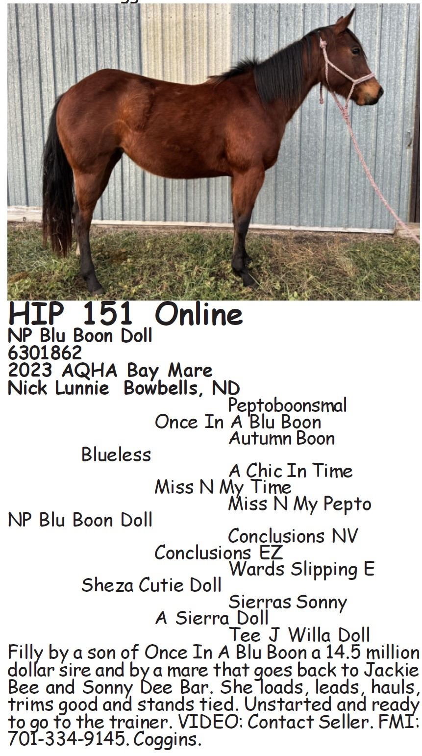 2023 AQHA Bay Mare x Blueless x Once In A Blu Boon out of Sheza Cutie Doll x Conclusions EZ. Filly by a son of Once In A Blu Boon a 14.5 million dollar sire and by a mare that goes back to Jackie Bee and Sonny Dee Bar. She loads, leads, hauls, trims good and stands tied. Unstarted and ready to go to the trainer. VIDEO: Contact Seller. FMI: 701-334-9145. Coggins.