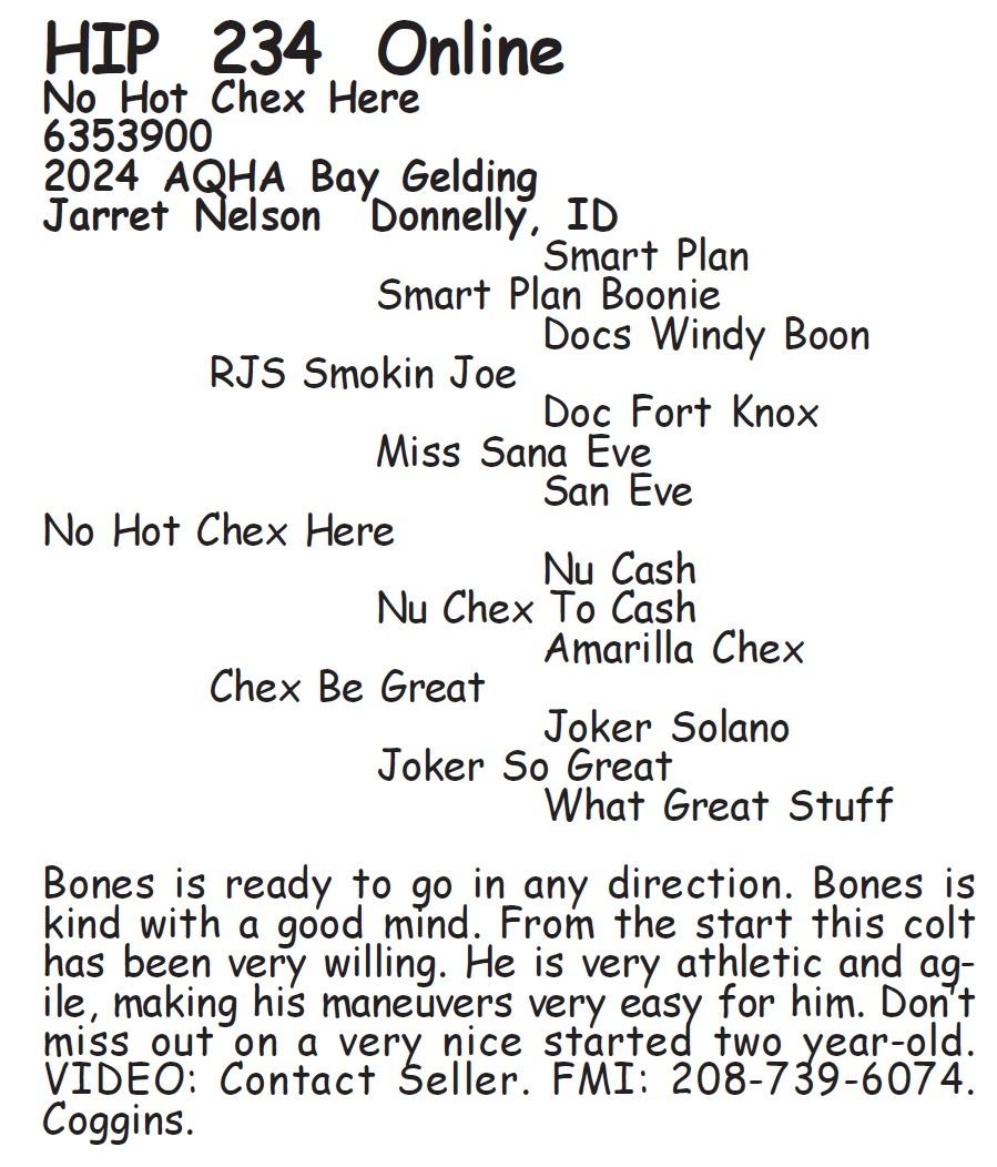 No Hot Chex Here - 6353900 - 2024 AQHA Bay Gelding - Jarret Nelson, Donnelly, ID - Bones is ready to go in any direction. Bones is kind with a good mind. From the start this colt has been very willing. He is very athletic and agile, making his maneuvers very easy for him. Don’t miss out on a very nice started two year-old. VIDEO: Contact Seller. FMI: 208-739-6074. Coggins.