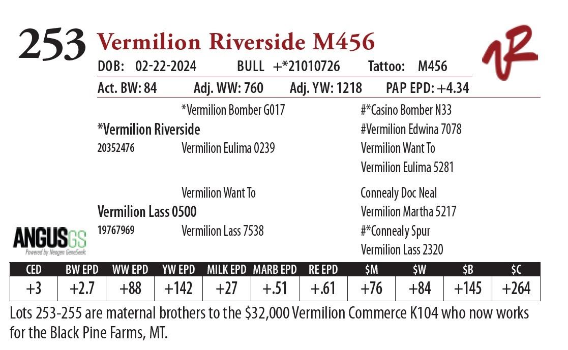 All bulls will be covered 50% by Vermilion Ranch if they are injured during their first breeding season. Breeding season is defined as the 60-day period following the first turnout of bulls.