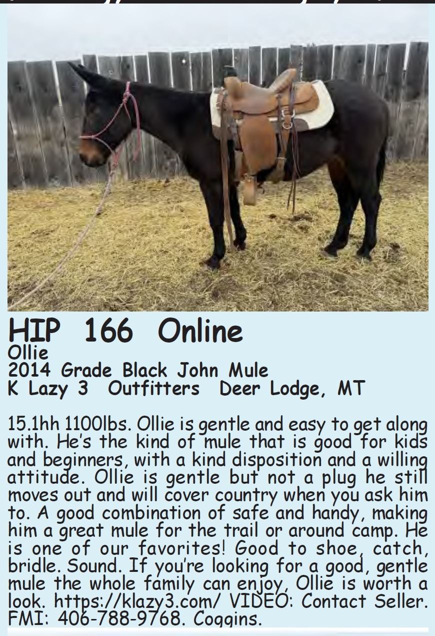 Ollie - 2014 Grade Black John Mule - K Lazy 3 Outfitters, Deer Lodge, MT - 15.1hh 1100lbs. Ollie is gentle and easy to get along with. He’s the kind of mule that is good for kids and beginners, with a kind disposition and a willing attitude. Ollie is gentle but not a plug he still moves out and will cover country when you ask him to. A good combination of safe and handy, making him a great mule for the trail or around camp. He is one of our favorites! Good to shoe, catch, bridle. Sound. If you’re looking for a good, gentle mule the whole family can enjoy, Ollie is worth a look. https://klazy3.com/ VIDEO: Contact Seller. FMI: 406-788-9768. Coggins.