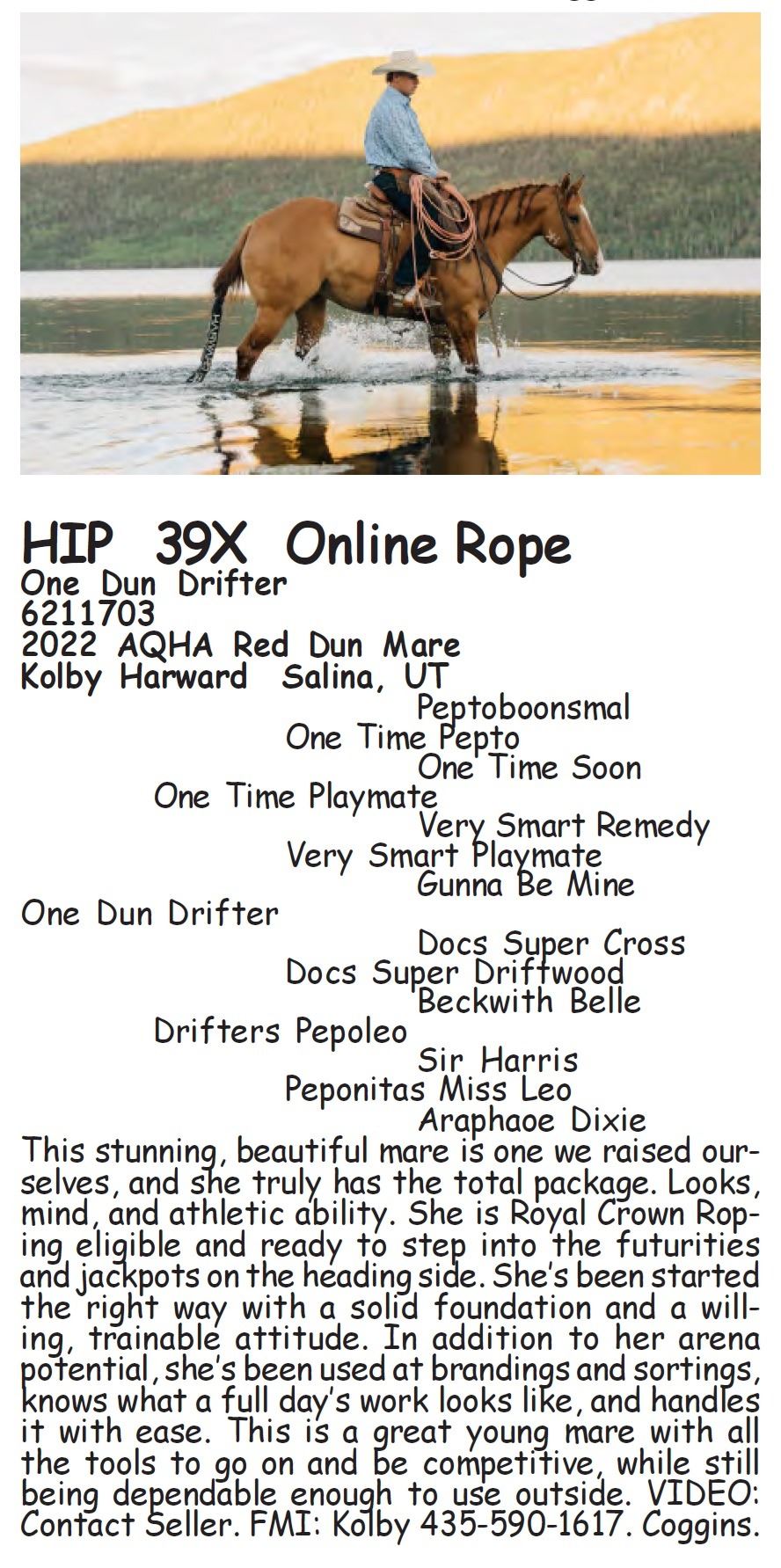 One Dun Drifter - 6211703 - 2022 AQHA Red Dun Mare - Kolby Harward, Salina, UT - This stunning, beautiful mare is one we raised ourselves, and she truly has the total package. Looks, mind, and athletic ability. She is Royal Crown Roping eligible and ready to step into the futurities and jackpots on the heading side. She’s been started the right way with a solid foundation and a willing, trainable attitude. In addition to her arena potential, she’s been used at brandings and sortings, knows what a full day’s work looks like, and handles it with ease. This is a great young mare with all the tools to go on and be competitive, while still being dependable enough to use outside. VIDEO: Contact Seller. FMI: Kolby 435-590-1617. Coggins.