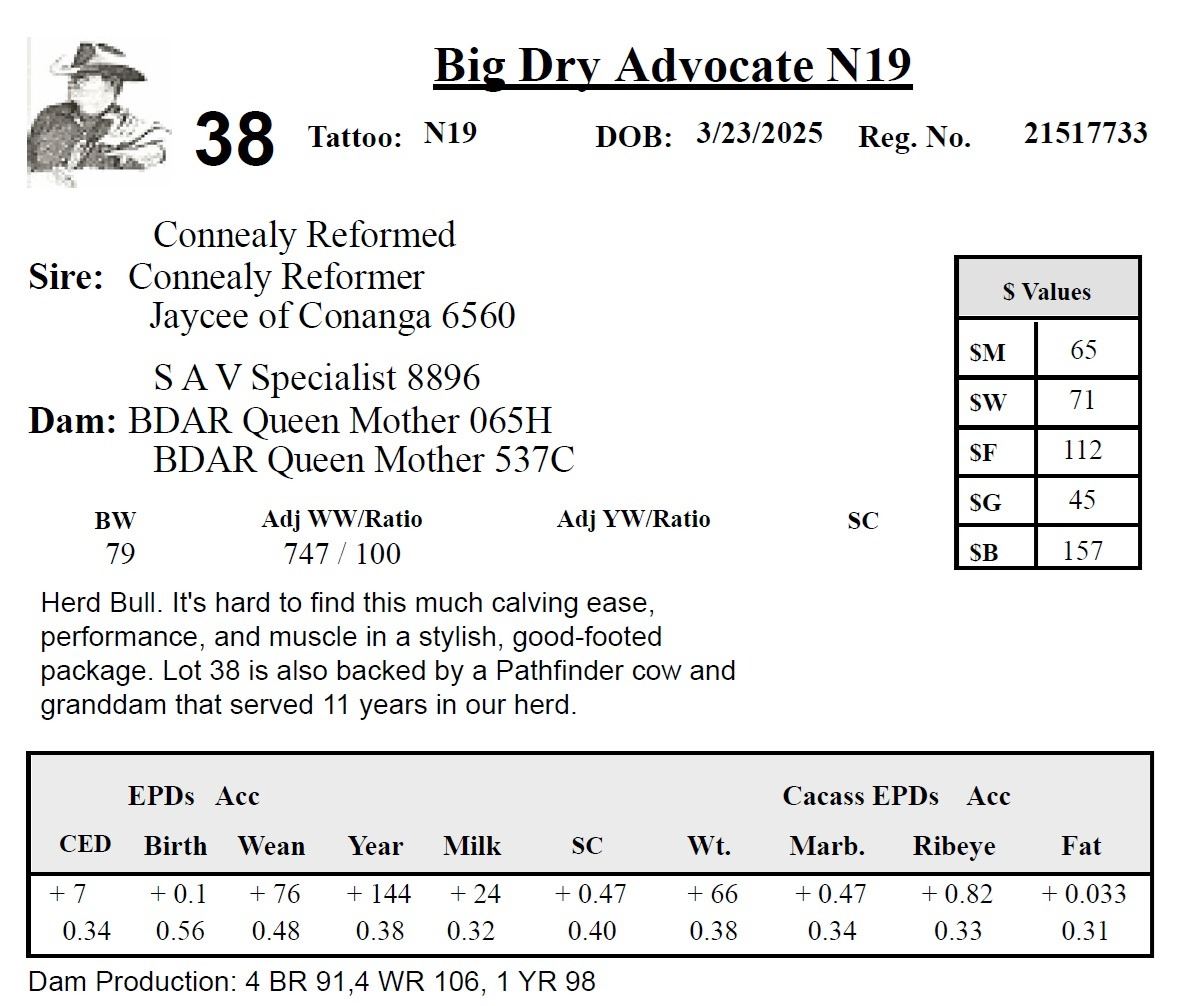 All persons who attend this sale do so at their own risk, legal or otherwise. Big Dry Angus assumes no liability for property loss or accident that may occur.