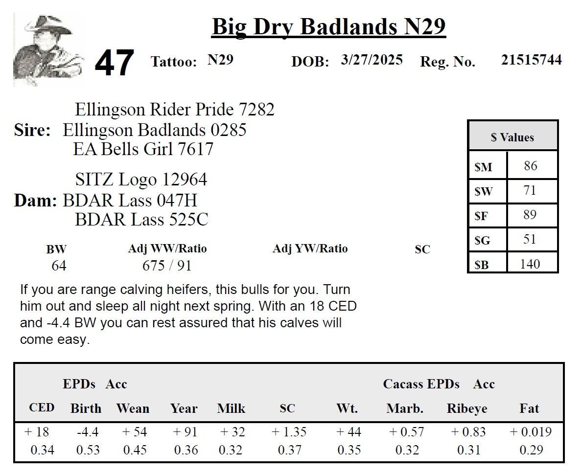 All persons who attend this sale do so at their own risk, legal or otherwise. Big Dry Angus assumes no liability for property loss or accident that may occur.