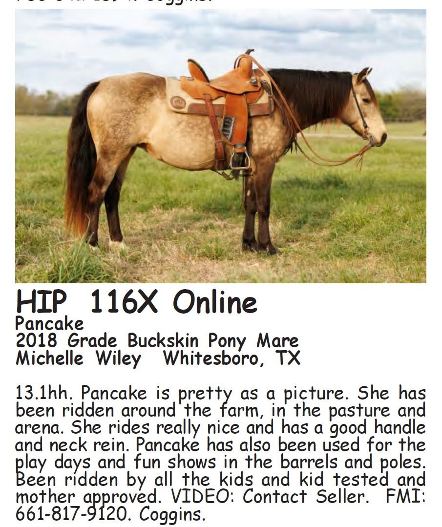 Pancake - 2018 Grade Buckskin Pony Mare - Michelle Wiley, Whitesboro, TX - 13.1hh. Pancake is pretty as a picture. She has been ridden around the farm, in the pasture and arena. She rides really nice and has a good handle and neck rein. Pancake has also been used for the play days and fun shows in the barrels and poles. Been ridden by all the kids and kid tested and mother approved. VIDEO: Contact Seller. FMI: 661-817-9120. Coggins.