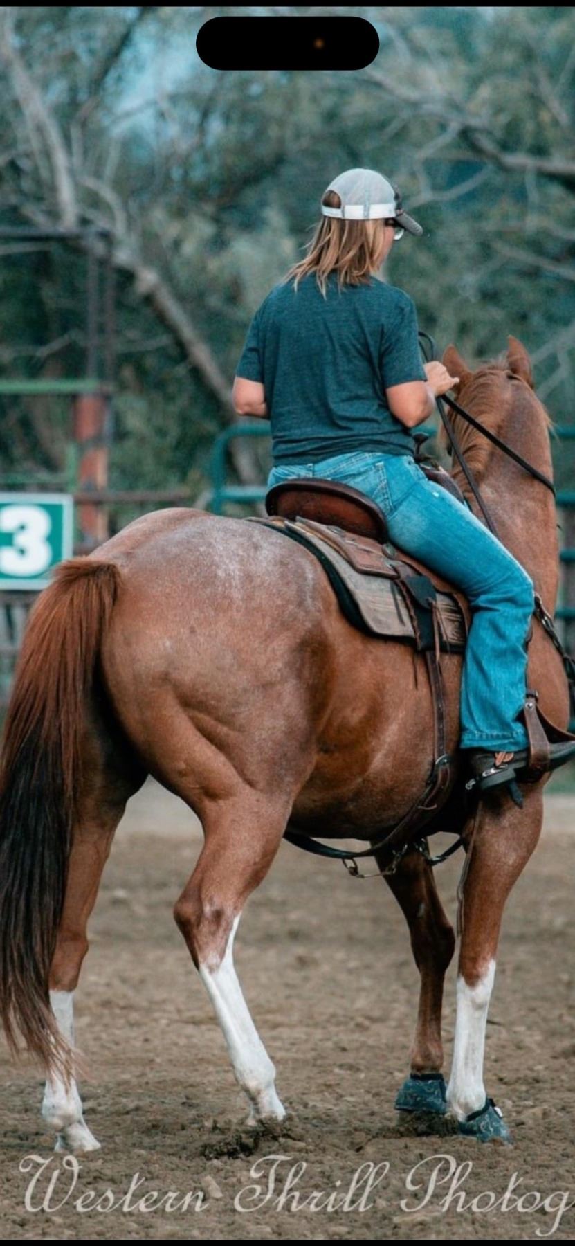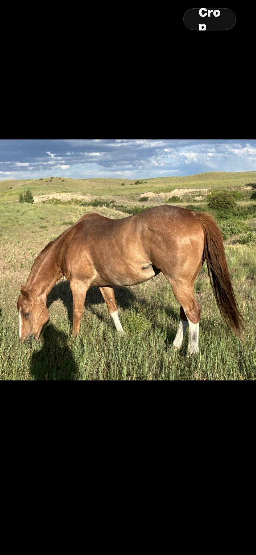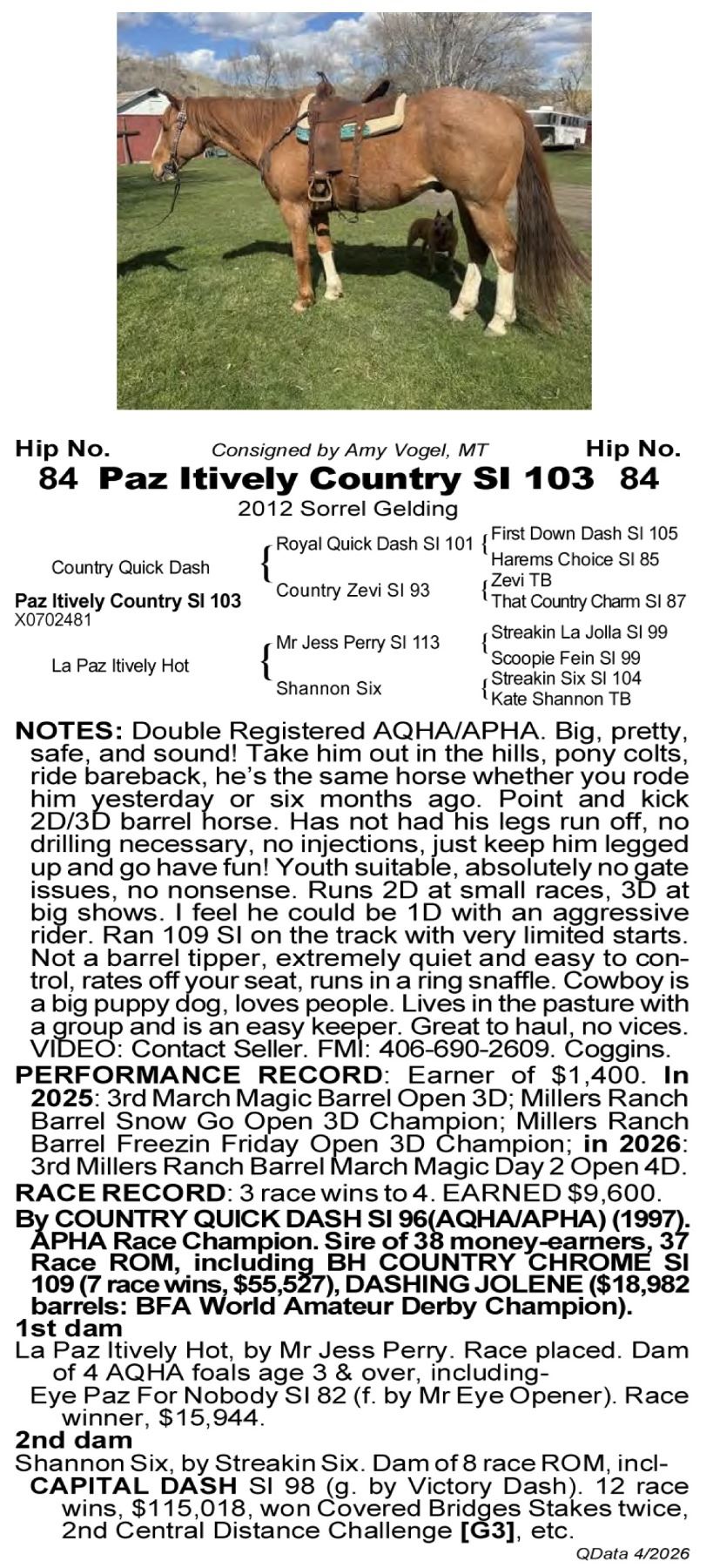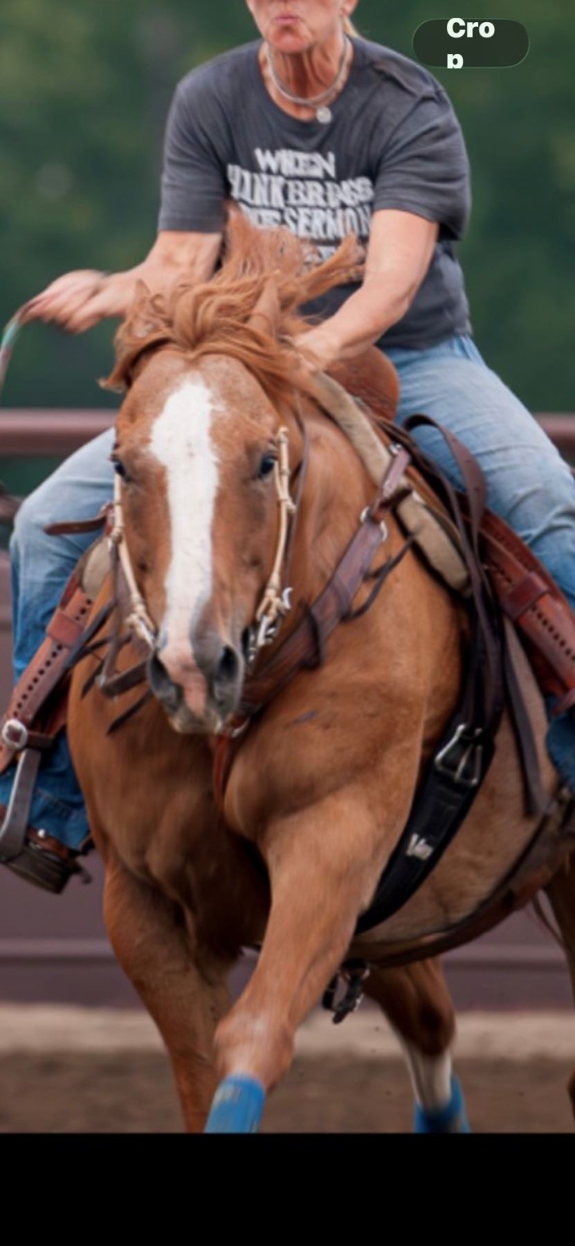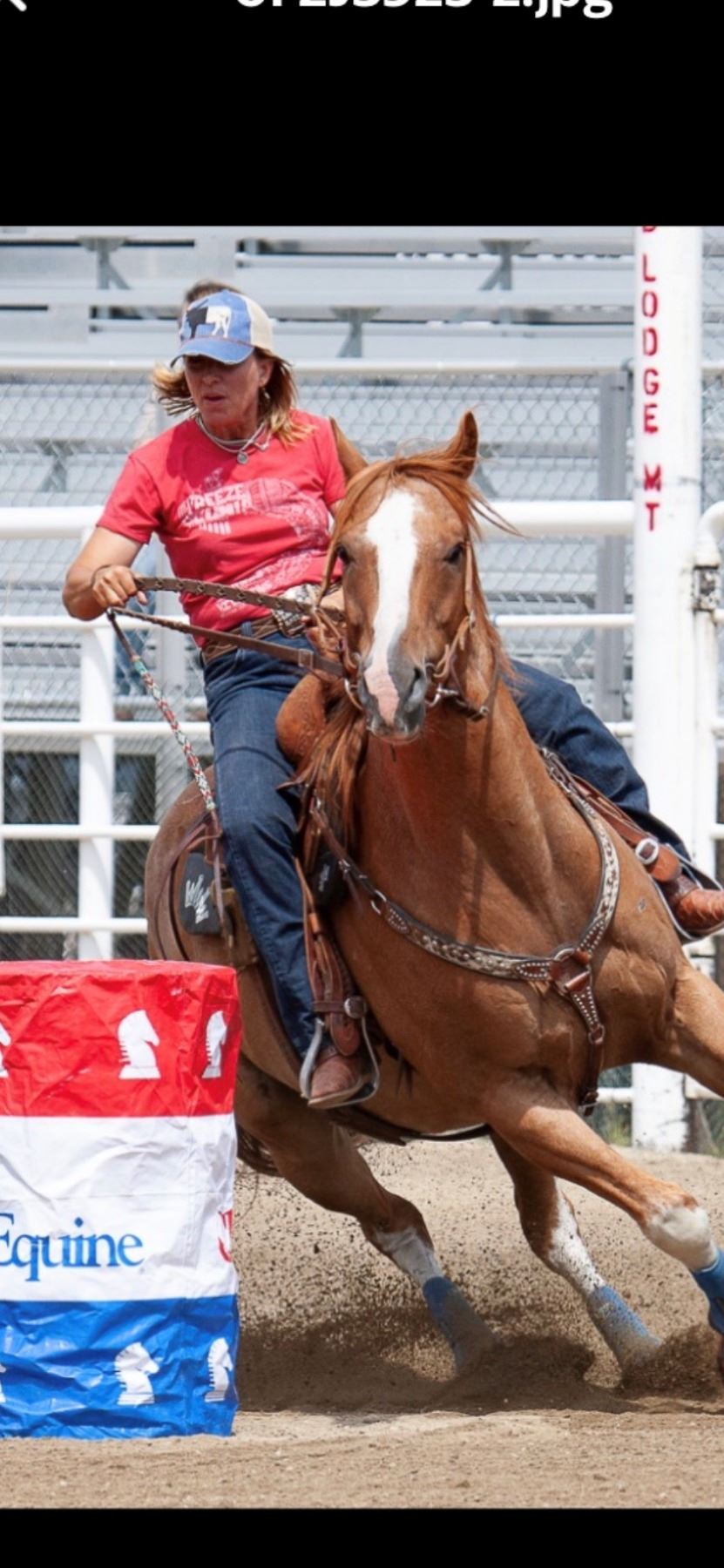 Paz Itively Country -X0702481 - 2012 AQHA/APHA Sorrel Gelding - Amy Vogel, Billings, MT - Double Registered AQHA/APHA Big, pretty, safe, and sound! Take him out in the hills, pony colts, ride bareback, he's the same horse whether you rode him yesterday or six months ago. Cowboy has been a pleasure to own and is so much fun to run! Point and kick 2D/3D barrel horse, stands up on any ground. Has not had his legs run off, no drilling necessary, no injections...just keep him legged up and go have fun! Youth suitable, absolutely no gate issues, no nonsense and not a hot or chargy horse at all. Runs 2D at small races, 3D at big shows. Very easy to jockey... anyone can run this horse! Extremely solid, consistent, honest, and correct on the barrels. I feel he could be 1D with an aggressive rider. Ran 109 si on the track with very limited starts. Not a barrel tipper, extremely quiet and easy to control, rates off your seat, runs in a ring snaffle. Does not need tuning. Cowboy is a big puppy dog, loves people. Lives in the pasture with a group and is an easy keeper. Great to haul, no vices. VIDEO: https://youtube.com/shorts/zf9qZm3nIEo?si=82DSQ-jDkhHclXeQ FMI: 406-690-2609. Coggins.