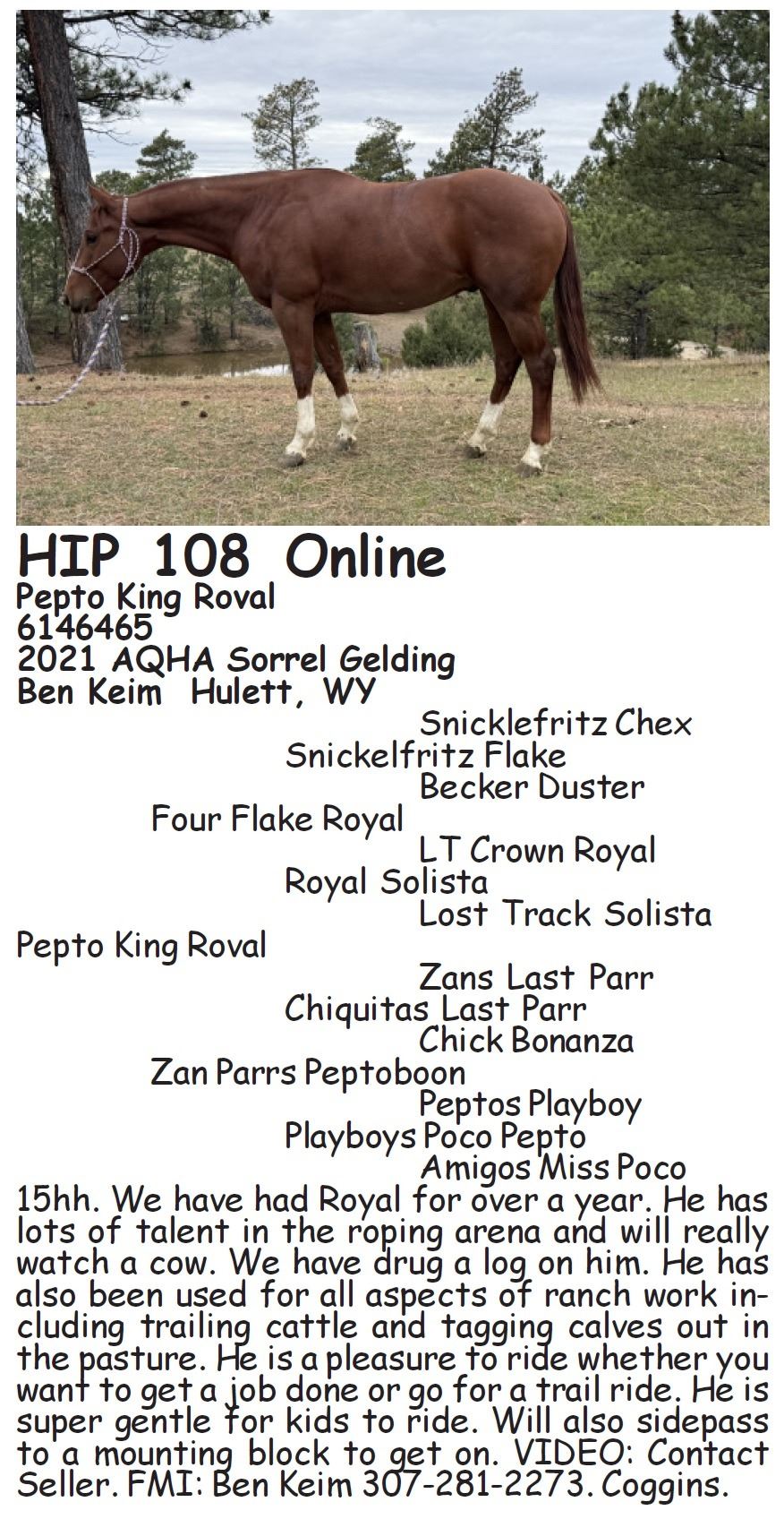 2021 AQHA Sorrel Gelding x Four Flake Royal x Snickelfritz Flake out of Zan Parrs PeptoBoon x Chiquitas Last Parr. 15hh. We have had Royal for over a year. He has lots of talent in the roping arena and will really watch a cow. We have drug a log on him. He has also been used for all aspects of ranch work including trailing cattle and tagging calves out in the pasture. He is a pleasure to ride whether you want to get a job done or go for a trail ride. He is super gentle for kids to ride. Will also sidepass to a mounting block to get on. VIDEO: Contact Seller. FMI: Ben Keim 307-281-2273. Coggins.