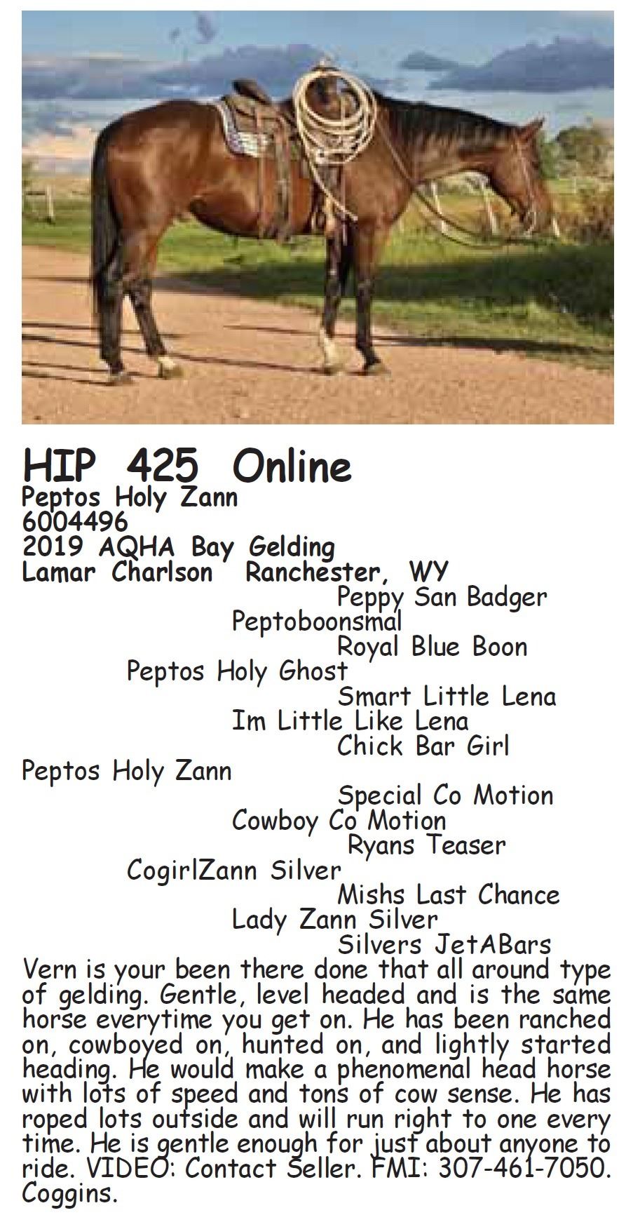 Vern is your been there done that all around type of gelding. Gentle, level headed and is the same horse everytime you get on. He has been ranched on, cowboyed on, hunted on, and lightly started heading. He would make a phenomenal head horse with lots of speed and tons of cow sense. He has roped lots outside and will run right to one every time. He is gentle enough for just about anyone to ride. VIDEO: Contact Seller. FMI: 307-461-7050. Coggins.
