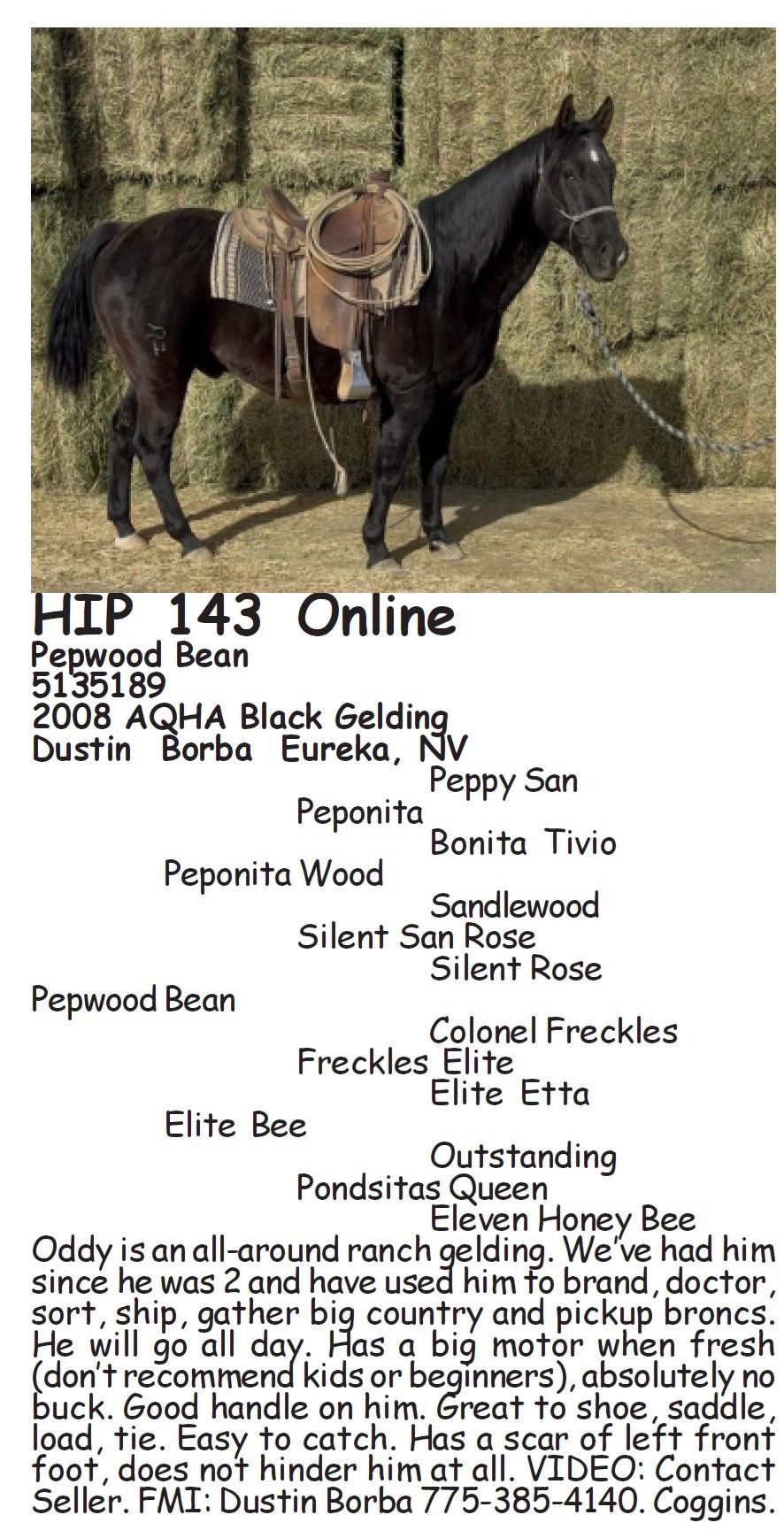 2008 AQHA Black Gelding x Peponita Wood x Peponita out of Elite Bee x Freckles Elite. Oddy is an all-around ranch gelding. We’ve had him since he was 2 and have used him to brand, doctor, sort, ship, gather big country and pickup broncs. He will go all day. Has a big motor when fresh (don’t recommend kids or beginners), absolutely no buck. Good handle on him. Great to shoe, saddle, load, tie. Easy to catch. Has a scar of left front foot, does not hinder him at all. VIDEO: Contact Seller. FMI: Dustin Borba 775-385-4140. Coggins.