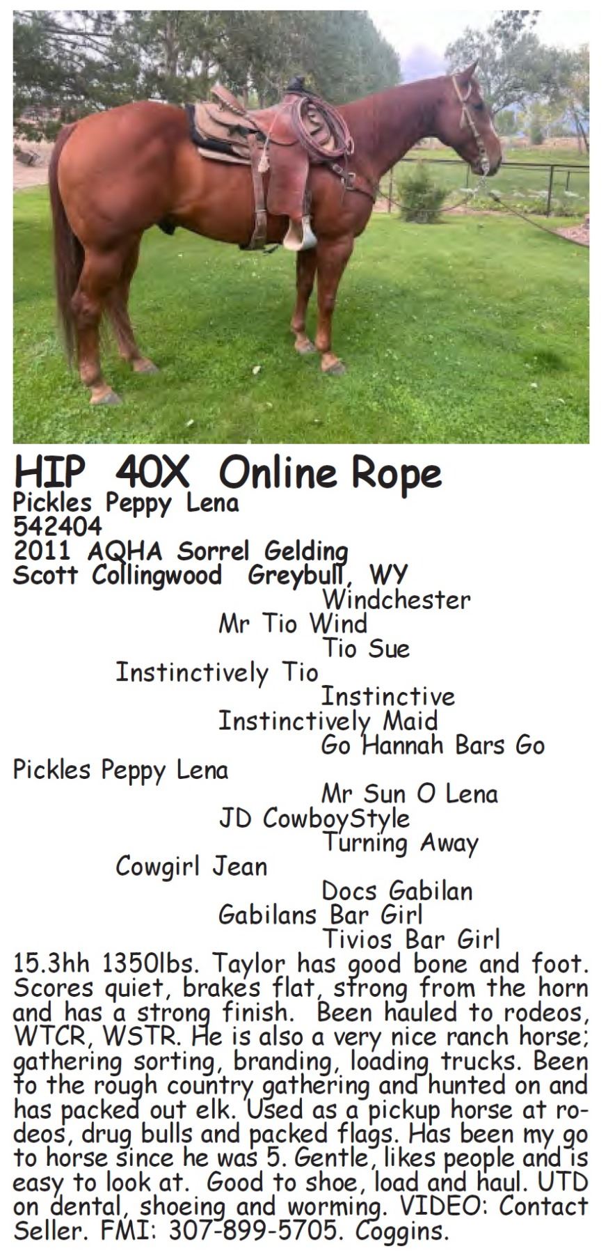 Pickles Peppy Lena - 542404 - 2011 AQHA Sorrel Gelding - Scott Collingwood, Greybull, WY - 15.3hh 1350lbs. Taylor has good bone and foot. Scores quiet, brakes flat, strong from the horn and has a strong finish. Been hauled to rodeos, WTCR, WSTR. He is also a very nice ranch horse; gathering sorting, branding, loading trucks. Been to the rough country gathering and hunted on and has packed out elk. Used as a pickup horse at rodeos, drug bulls and packed flags. Has been my go to horse since he was 5. Gentle, likes people and is easy to look at. Good to shoe, load and haul. UTD on dental, shoeing and worming. VIDEO: Contact Seller. FMI: 307-899-5705. Coggins.