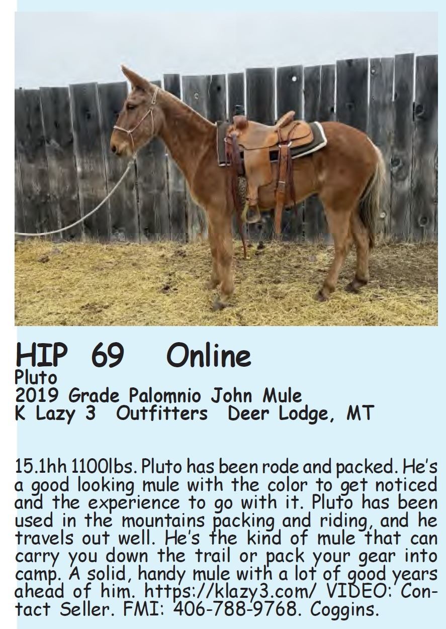 Pluto - 2019 Grade Palomnio John Mule - K Lazy 3 Outfitters, Deer Lodge, MT - 15.1hh 1100lbs. Pluto has been rode and packed. He’s a good looking mule with the color to get noticed and the experience to go with it. Pluto has been used in the mountains packing and riding, and he travels out well. He’s the kind of mule that can carry you down the trail or pack your gear into camp. A solid, handy mule with a lot of good years ahead of him. https://klazy3.com/ VIDEO: Contact Seller. FMI: 406-788-9768. Coggins.
