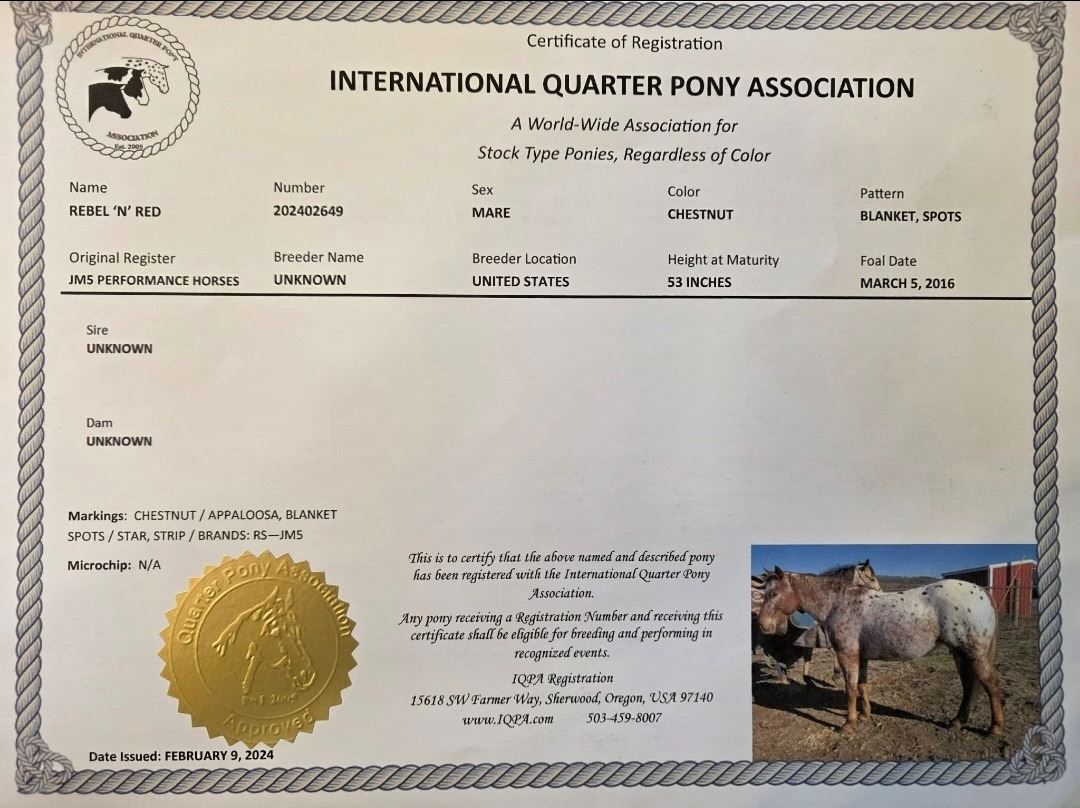 2016 INTERNATIONAL QUARTER PONNY ASSOC. Chestnut Appaloosa Mare.