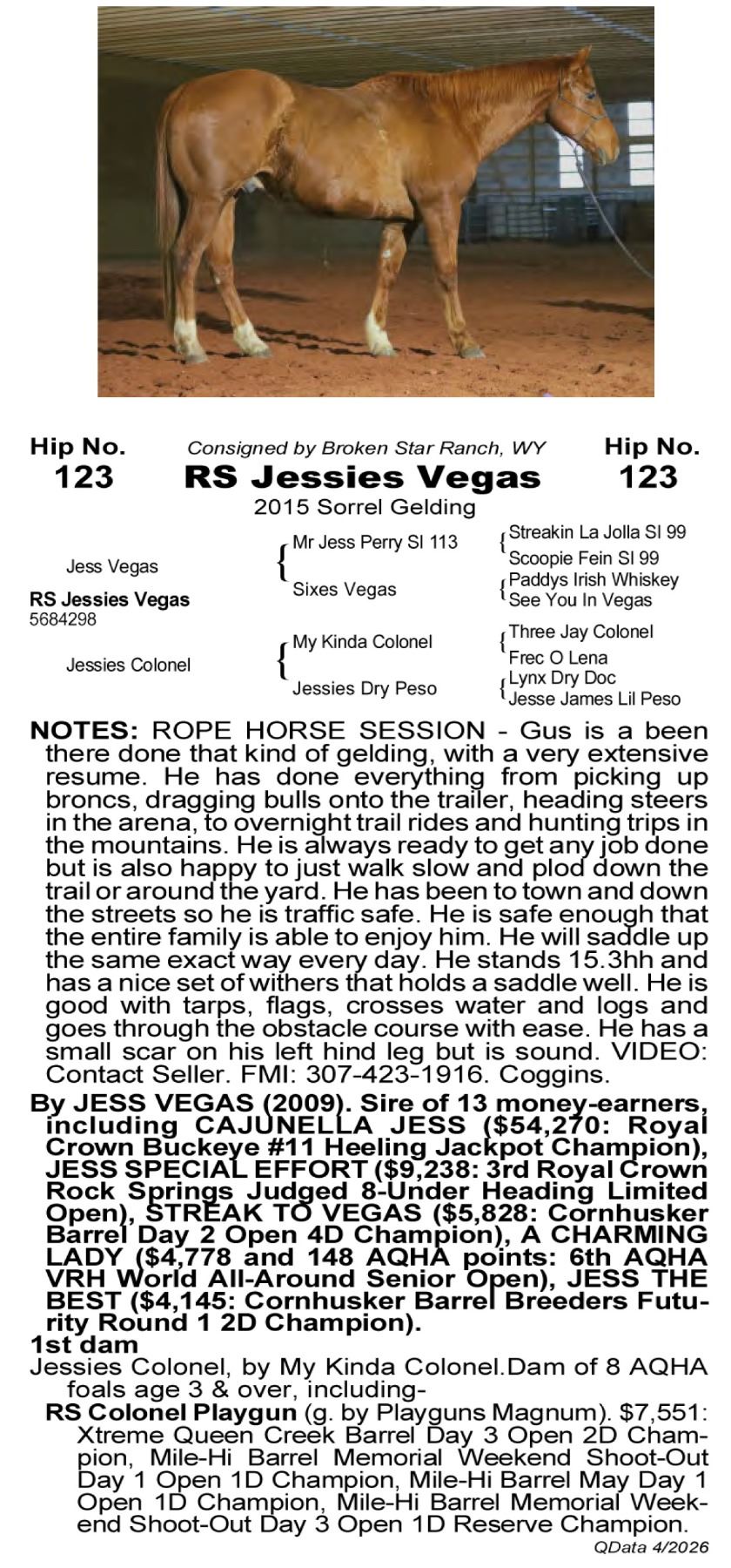 RS Jessies Vegas -5684298 - 2015 AQHA Sorrel Gelding - Broken Star Ranch, Ranchester, WY - Gus is a been there done that kind of gelding, with a very extensive resume. He has done everything from picking up broncs, dragging bulls onto the trailer, heading steers in the arena, to overnight trail rides and hunting trips in the mountains. He is always ready to get any job done but is also happy to just walk slow and plod down the trail or around the yard. He has been to town and down the streets so he is traffic safe. He is safe enough that the entire family is able to enjoy him. He will saddle up the same exact way every day. He stands 15.3hh and has a nice set of withers that holds a saddle well. He is good with tarps, flags, crosses water and logs and goes through the obstacle course with ease. He has a small scar on his left hind leg but is sound. VIDEO: Contact Seller. FMI: 307-423-1916. Coggins.