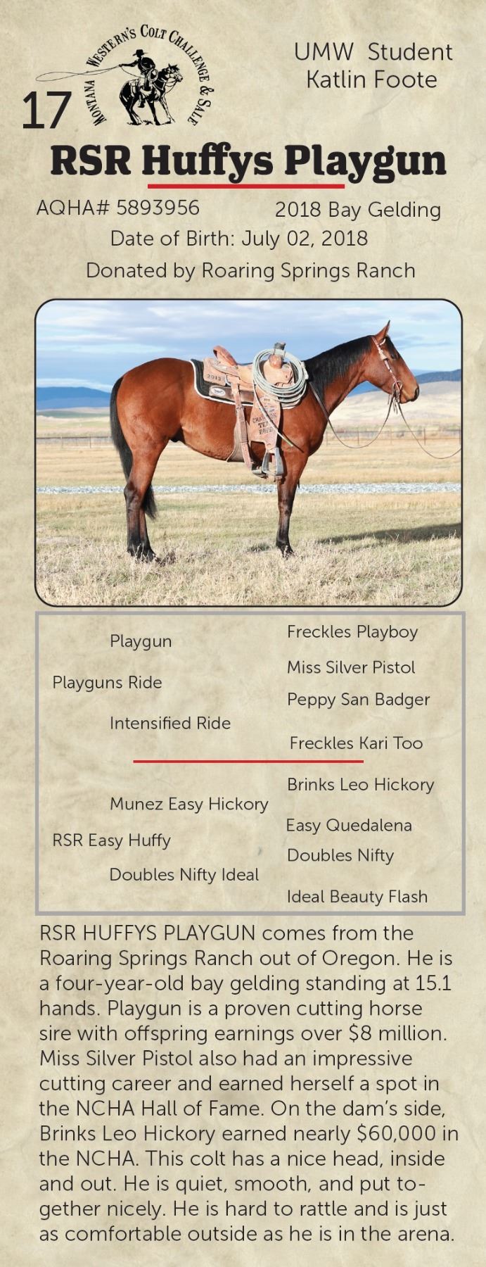 RSR Huffys Playgun comes from the Roaring Springs Ranch out of Oregon. He is a 4 yr old bay gelding standing at 15.1 hands. Playgun is a proven cutting horse sire with offspring earnings over $8 million. Miss Silver Pistol also had an impressive cutting career and earned herself a spot in the NCHA Hall of Fame. On the dam's side, Brinks Leo Hickory earned nearly $60,000 in the NCHA. This colt has a nice head, inside and out. He is quiet, smooth, and put together nicely. He is hard to rattle and is just as comfortable outside as he is in the arena.