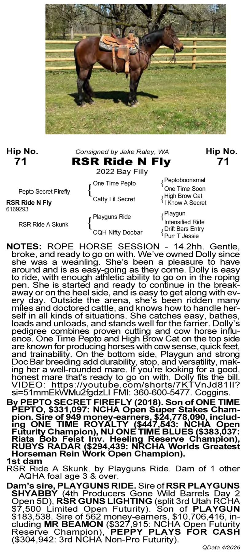 RSR Ride N Fly - 6169293 - 2022 AQHA Bay Mare - Jake Raley, Brush Prairie, WA - 14.2hh. Gentle, broke, and ready to go on with. We’ve owned Dolly since she was a weanling. She’s been a pleasure to have around and is as easy-going as they come. Dolly is gentle, willing, and easy to ride, with enough athletic ability to go on in the roping pen. She is started and ready to continue in the breakaway or on the heel side, and has the kind of mind that makes her easy to get along with every day. Outside the arena, she’s been ridden many miles and doctored cattle, and knows how to handle herself in all kinds of situations. She is very easy to be around—catches easy, bathes, loads and unloads, and stands well for the farrier. Dolly’s pedigree combines proven cutting and cow horse influence. One Time Pepto and High Brow Cat on the top side are known for producing horses with cow sense, quick feet, and trainability. On the bottom side, Playgun and strong Doc Bar breeding add durability, stop, and versatility, making her a well-rounded mare suited for both arena work and ranch use. If you’re looking for a good, honest mare that’s ready to go on with, Dolly fits the bill. VIDEO: https://youtube.com/shorts/7KTVnJd81II?si=51mmEkWMu2fgdzLI FMI: 360-600-5477. Coggins.