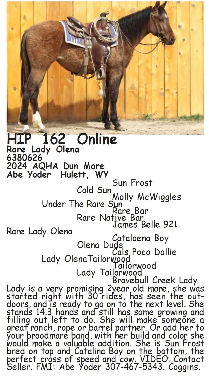 Rare Lady Olena - 6380626 - 2024 AQHA Dun Mare - Abe Yoder, Hulett, WY - Lady is a very promising 2year old mare, she was started right with 30 rides, has seen the outdoors, and is ready to go on to the next level. She stands 14.3 hands and still has some growing and filling out left to do. She will make someone a great ranch, rope or barrel partner. Or add her to your broodmare band, with her build and color she would make a valuable addition. She is Sun Frost bred on top and Catalina Boy on the bottom, the perfect cross of speed and cow. VIDEO: Contact Seller. FMI: Abe Yoder 307-467-5343. Coggins.
