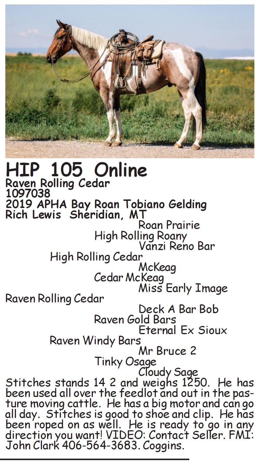 2019 APHA Bay Roan Tobiano Gelding x High Rolling Cedar x High Rolling Roany out of Raven Windy Bars x Raven Gold Bars. Stitches stands 14 2 and weighs 1250. He has been used all over the feedlot and out in the pasture moving cattle. He has a big motor and can go all day. Stitches is good to shoe and clip. He has been roped on as well. He is ready to go in any direction you want! VIDEO: Contact Seller. FMI: John Clark 406-564-3683. Coggins.
