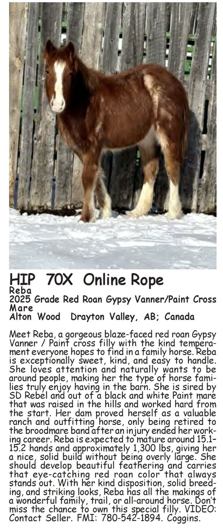 Reba - 2025 Grade Red Roan Gypsy Vanner/Paint Cross Mare - Alton Wood, Drayton Valley, AB; Canada - Meet Reba, a gorgeous blaze-faced red roan Gypsy Vanner / Paint cross filly with the kind temperament everyone hopes to find in a family horse. Reba is exceptionally sweet, kind, and easy to handle. She loves attention and naturally wants to be around people, making her the type of horse families truly enjoy having in the barn. She is sired by SD Rebel and out of a black and white Paint mare that was raised in the hills and worked hard from the start. Her dam proved herself as a valuable ranch and outfitting horse, only being retired to the broodmare band after an injury ended her working career. Reba is expected to mature around 15.1–15.2 hands and approximately 1,300 lbs, giving her a nice, solid build without being overly large. She should develop beautiful feathering and carries that eye-catching red roan color that always stands out. With her kind disposition, solid breeding, and striking looks, Reba has all the makings of a wonderful family, trail, or all-around horse. Don’t miss the chance to own this special filly. VIDEO: Contact Seller. FMI: 780-542-1894. Coggins.