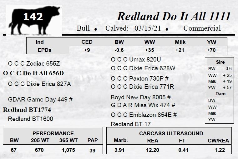 All bulls selling for $2,500 or more will be covered 50% by Redland Angus if they are injured during their first breeding season.
