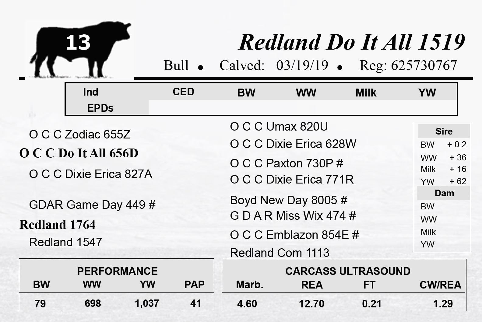 All bulls selling for $2,500 or more will be covered 50% by Redland Angus if they are injured during their first breeding season.