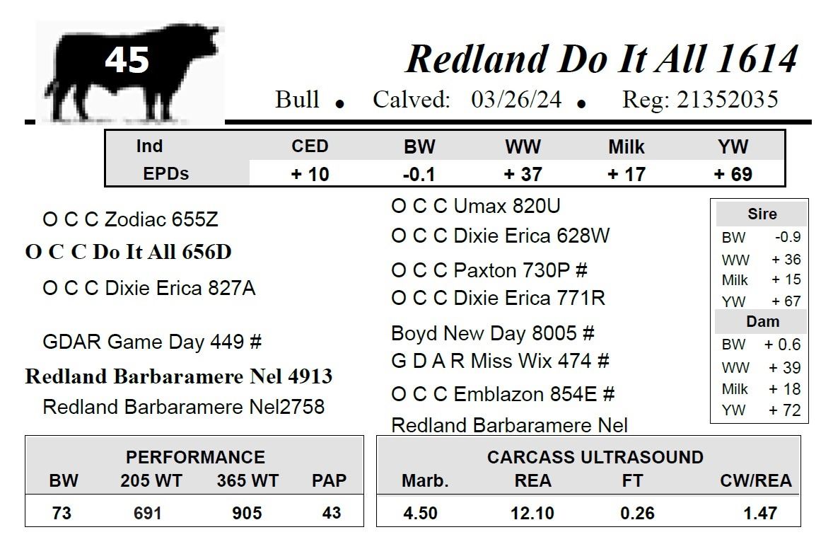 All bulls selling for $2,500 or more will be covered 50% by Redland Angus if they are injured during their first breeding season.