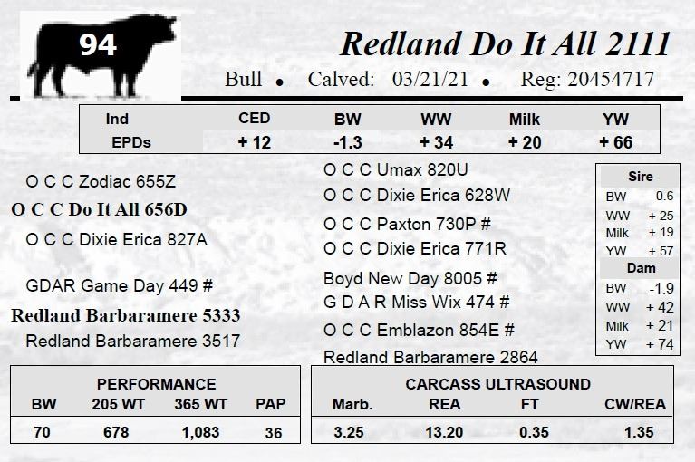 All bulls selling for $2,500 or more will be covered 50% by Redland Angus if they are injured during their first breeding season.