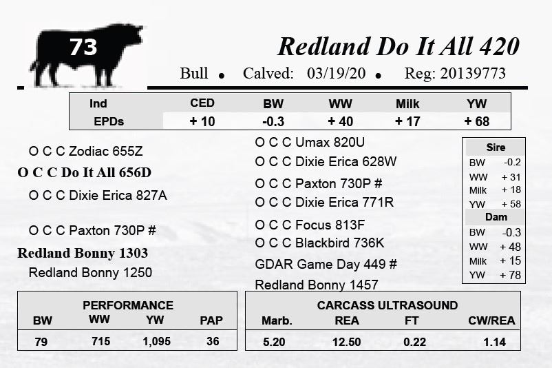 All bulls selling for $2,500 or more will be covered 50% by Redland Angus if they are injured during their first breeding season.