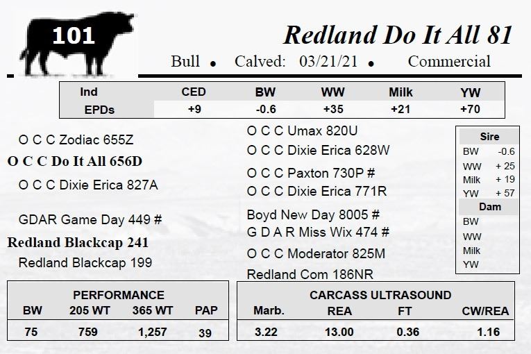 All bulls selling for $2,500 or more will be covered 50% by Redland Angus if they are injured during their first breeding season.