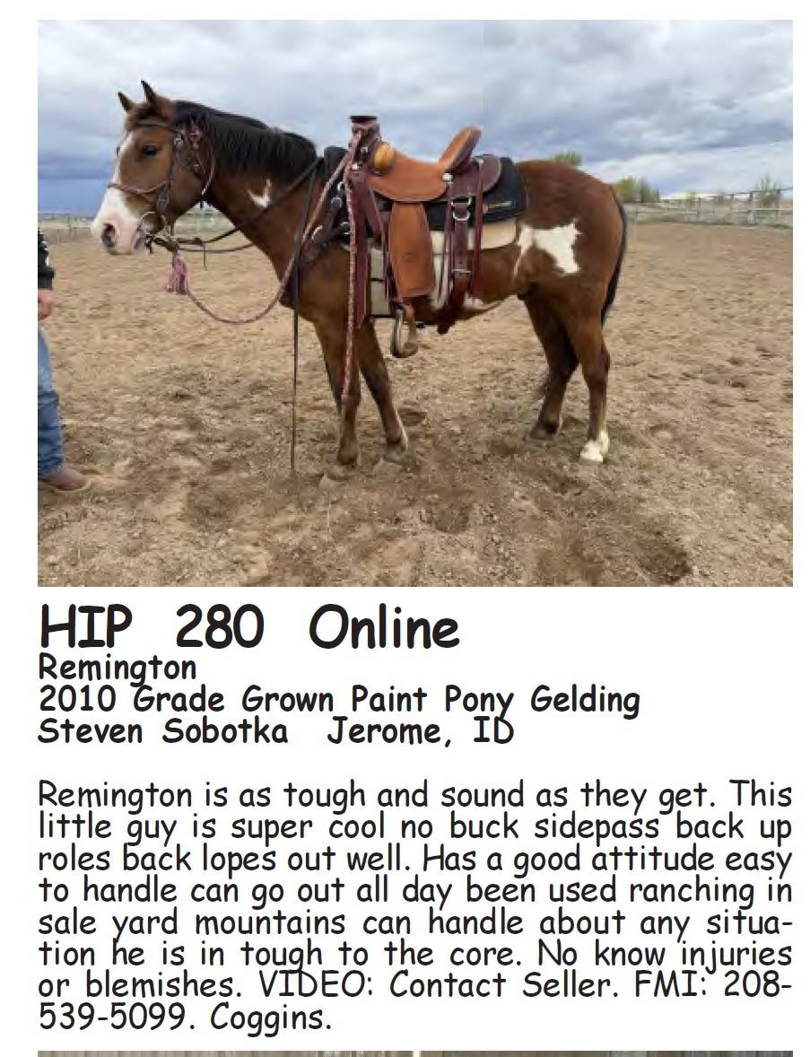 Remington - 2010 Grade Grown Paint Pony Gelding - Steven Sobotka, Jerome, ID - Remington is as tough and sound as they get. This little guy is super cool no buck sidepass back up roles back lopes out well. Has a good attitude easy to handle can go out all day been used ranching in sale yard mountains can handle about any situation he is in tough to the core. No know injuries or blemishes. VIDEO: Contact Seller. FMI: 208-539-5099. Coggins.