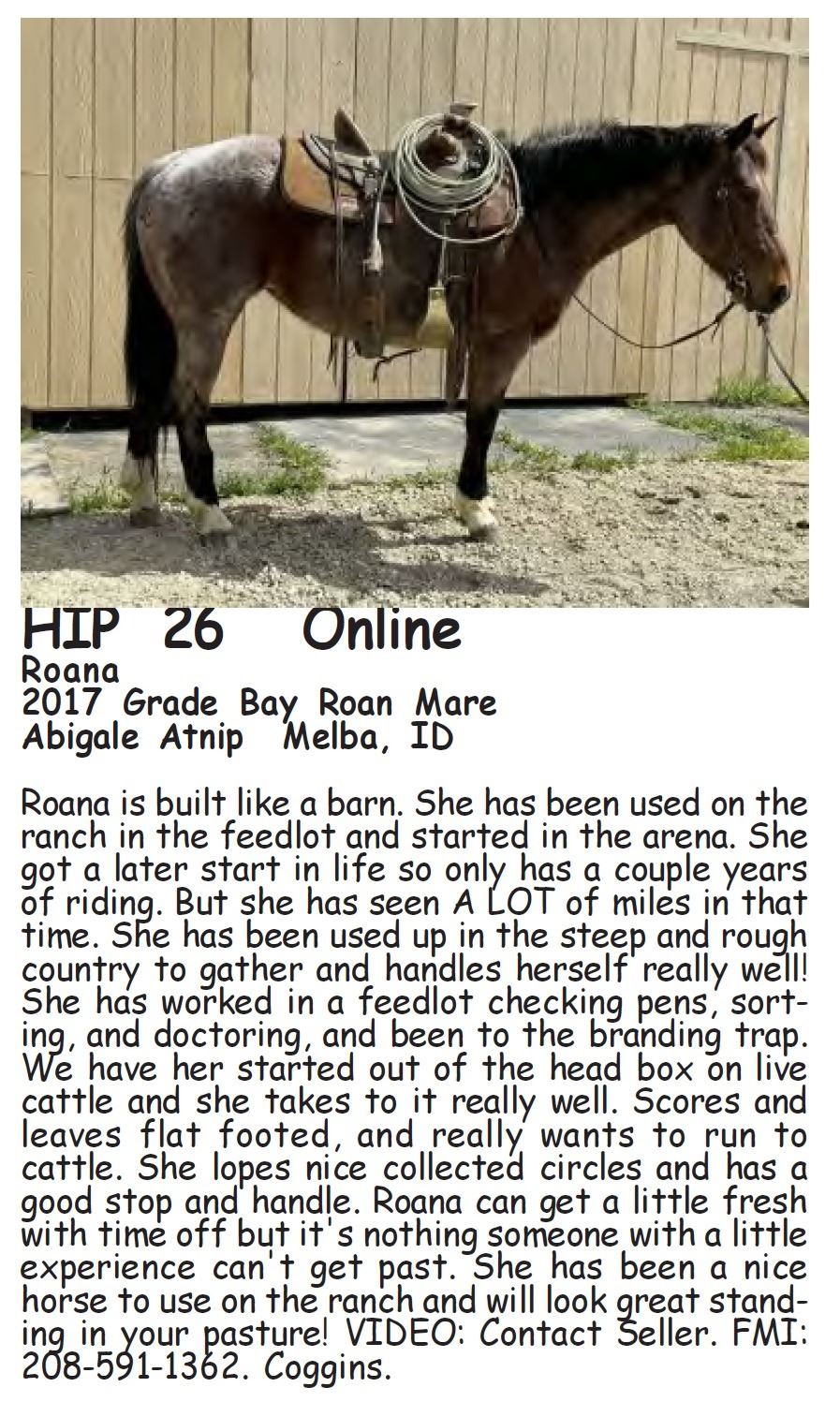 Roana - 2017 Grade Bay Roan Mare - Abigale Atnip, Melba, ID - Roana is built like a barn. She has been used on the ranch in the feedlot and started in the arena. She got a later start in life so only has a couple years of riding. But she has seen A LOT of miles in that time. She has been used up in the steep and rough country to gather and handles herself really well! She has worked in a feedlot checking pens, sorting, and doctoring, and been to the branding trap. We have her started out of the head box on live cattle and she takes to it really well. Scores and leaves flat footed, and really wants to run to cattle. She lopes nice collected circles and has a good stop and handle. Roana can get a little fresh with time off but it's nothing someone with a little experience can't get past. She has been a nice horse to use on the ranch and will look great standing in your pasture! VIDEO: Contact Seller. FMI: 208-591-1362. Coggins.