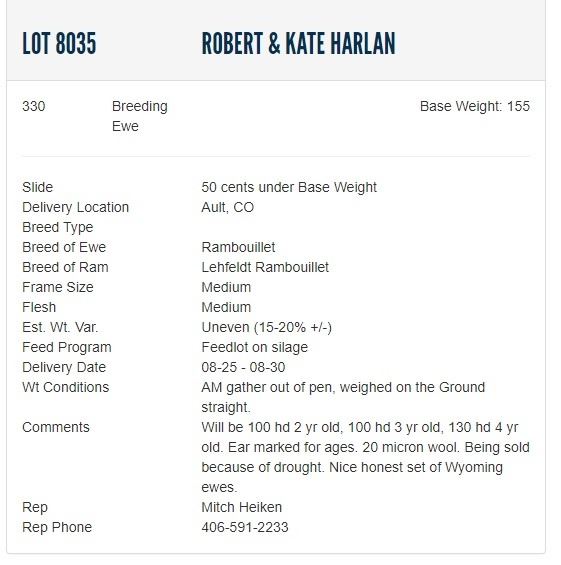 Comments Will be 100 hd 2 yr old, 123 hd 3 yr old, 83 hd 4 yr old. Ear marked for ages. 20 micron wool. Being sold because of drought. Nice honest set of Wyoming ewes.